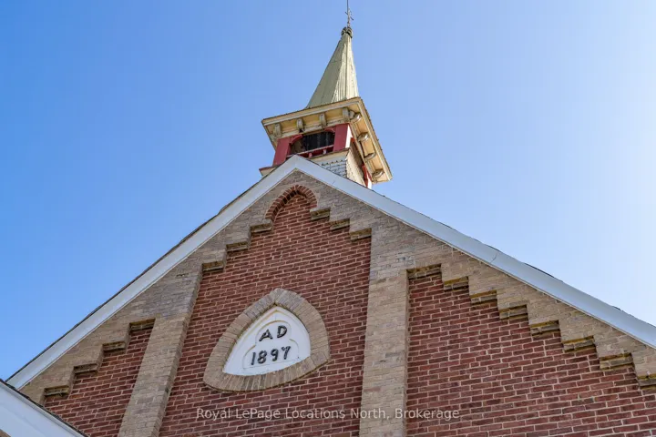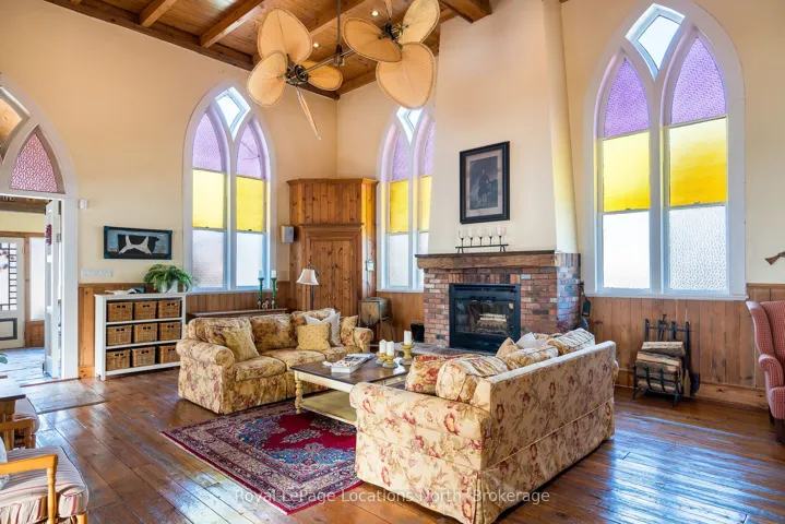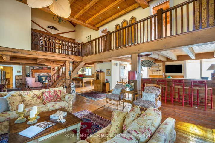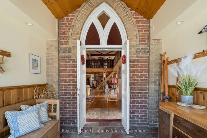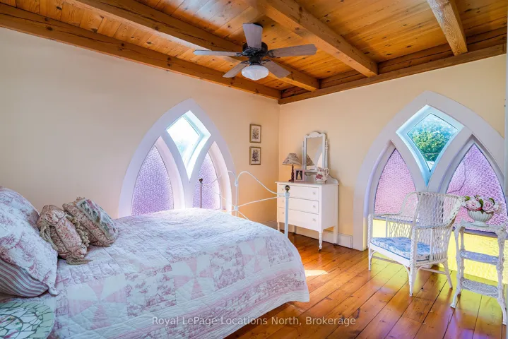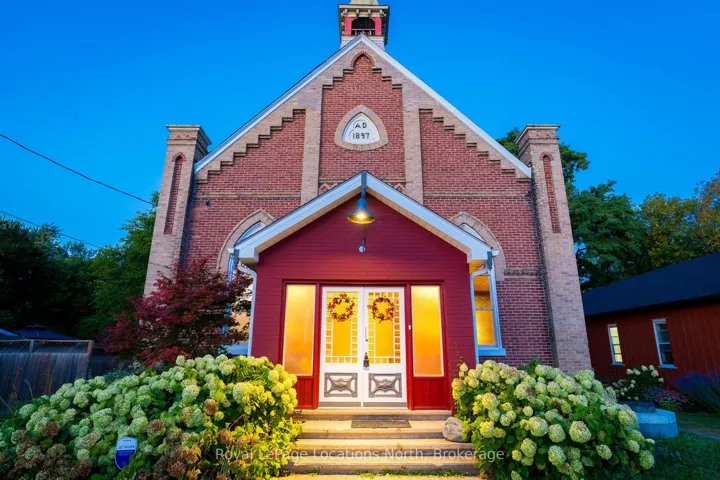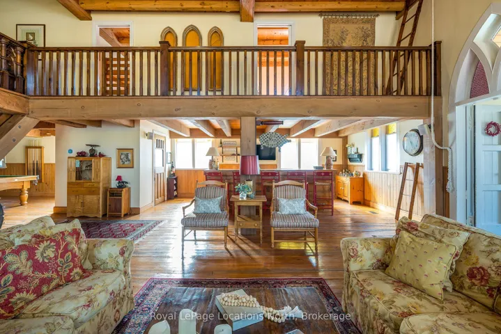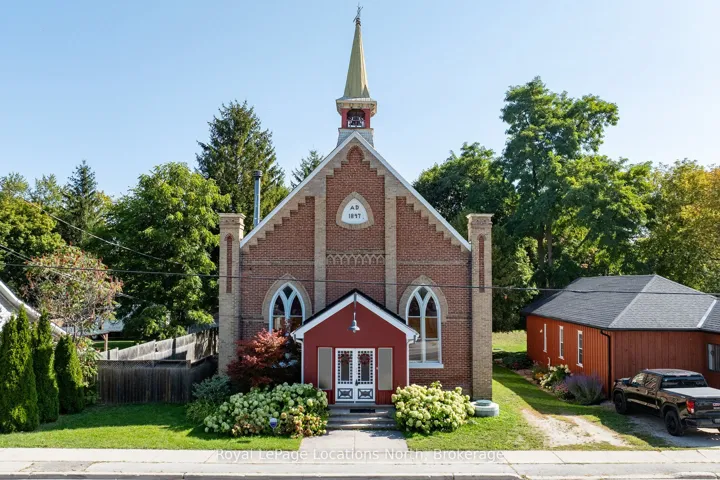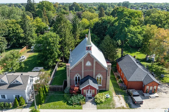 +"PublicRemarks": "When you step inside this unique, renovated 1897 church, you can't help but imagine the fabulous holidays your family and friends would enjoy here. On the main street of the charming village of Nottawa, this is a home meant for gathering. This rare opportunity is absolutely full of thoughtful touches and decor lavished on it by its current owners, and all those touches are included in the sale. Furnishings, linens, rugs, art, lamps, antiques, even the dishes, all come with the house so moving in will be easy. Your family will enjoy the restful and restorative atmosphere of the main floor with the soft light of stained glass. The sprawling living space under post and beam cathedral ceilings has a chalet like feel. It features a primary seating area in front of a wood burning fireplace with a wonderful long and welcoming bar for entertaining. The bar itself was recovered from an old general store. An adjoining space houses another seating area in front of a gas fireplace and a large billiards table. The dining table seats 14 so no card tables will be necessary. Each space is wide open yet beautifully defined with a combination of historic details and new improvements. You will have room for all your guests in the five upstairs bedrooms, all stylishly decorated and all enjoying the comforting glow of stained glass windows.The main floor den has a pull out sofa bed and an ensuite bathroom for additional sleeping quarters. It is a home to wander in, explore, and bask in its warmth and coziness. Outside, a large backyard deck allows space for an oversized bbq and an enormous hot tub, all under a beautiful canopy of mature trees. Multiple sheds for storage and potting make maintenance easy -- and even the garden equipment is included."
