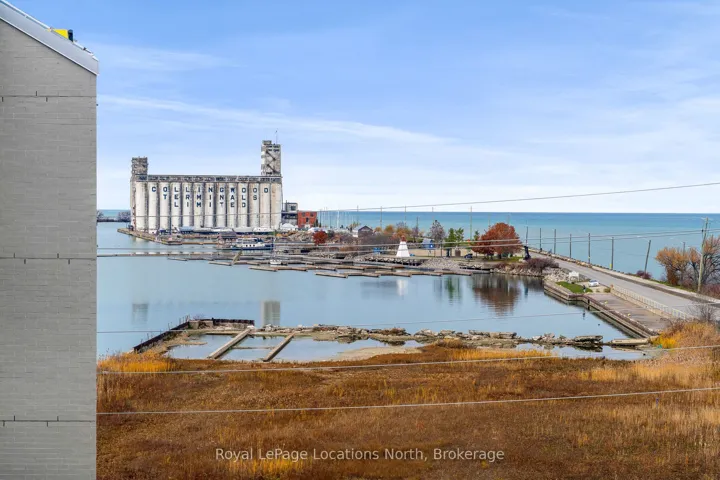 +"PublicRemarks": "Welcome to Harbour House, Collingwood's premier new condominium address where contemporary design meets waterfront beauty. Perched on the 5th floor, this pretty suite offers stunning water views and a level of elegance that perfectly complements its coveted downtown location. Thoughtfully designed, this 2-bedroom, 2-bathroom condo features 910 sq. ft. of one-level living. The Scandinavian-inspired aesthetic is both serene and luxurious, with a modern open-concept layout that invites an effortless flow. Designer finishes and natural textures subtly echo the surrounding landscape, creating a warm atmosphere. The chef's kitchen offers a generous sit-up island with waterfall quartz counter and custom cabinetry with under-mount lighting, crafted for both beauty and function. The primary bedroom is a tranquil retreat with views of Georgian Bay. The private ensuite features a sleek glass walk-in shower. Extend the living space onto the 150 sq. ft. balcony where panoramic views of Georgian Bay and the Collingwood Terminals create a breathtaking backdrop for morning coffee or evening unwinding. This residence includes an exclusive underground parking spot and private storage locker. Harbour House's amenities elevate everyday living - enjoy a fully equipped fitness centre, dog & gear wash stations, guest suites for overnight company, secure fobbed entry and a rooftop party room & media lounge (to be completed) both with outdoor terraces overlooking Georgian Bay. All this within an architecturally stunning, nature-focused building. With shops, dining, and essentials just steps away, Harbour House offers a sophisticated lifestyle defined by comfort, convenience, and the timeless beauty of Georgian Bay."