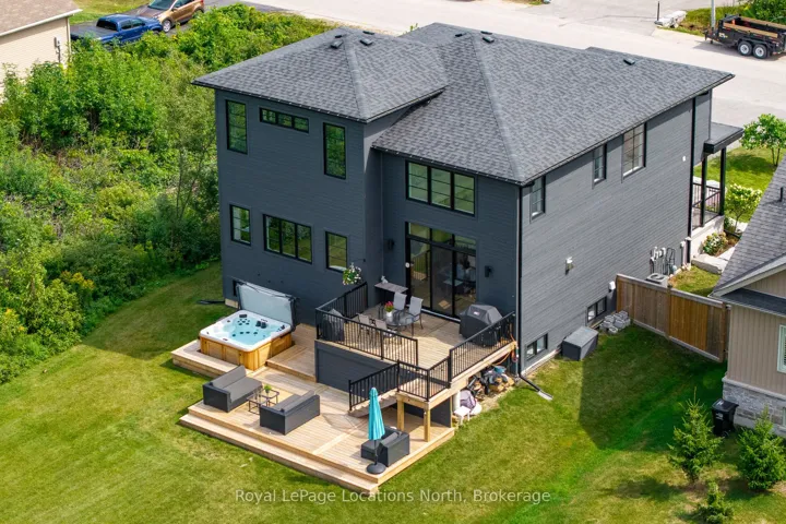 +"PublicRemarks": "Welcome to one of Collingwood's most exclusive addresses, where elegance and comfort blend seamlessly in this custom-built two-storey home. Set on an impressive 66 x 167 ft full town lot, this residence offers over 3,700 sq ft of beautifully finished living space, with 5 bedrooms and 4 bathrooms designed for modern family living and entertaining. From the moment you step inside, soaring ceilings and sun-filled windows create a sense of openness and light. The main floor showcases wide-plank white oak engineered hardwood and thoughtful details throughout. At the heart of the home, the gourmet kitchen invites gathering with its quartz countertops, oversized island, and high-end appliances. The living room makes a statement with its dramatic 20-ft ceiling, cozy gas fireplace, and expansive sliding doors that lead to a private and peaceful backyard. Upstairs, retreat to the luxurious primary suite with remote-controlled blinds, a spacious walk-in closet, and a spa-inspired ensuite featuring double sinks, glass shower, and soaker tub. Two additional spacious bedrooms share a stylish Jack & Jill bathroom, perfect for family or guests. The fully finished lower level extends the living space with a generous recreation room, two more bedrooms, and a five-piece bath. Modern touches like shiplap and barnboard accents bring warmth and character throughout. Outdoors, enjoy a two-tiered deck and hot tub surrounded by nature. The large, private yard would be perfect for a pool. With amazing neighbours, a walkable location to Collingwood's best schools and downtown, and endless style and comfort, this home is truly a must see."