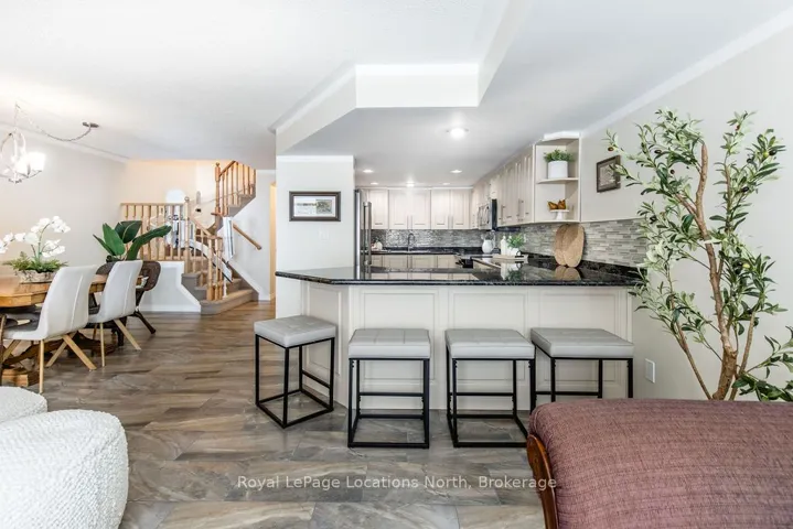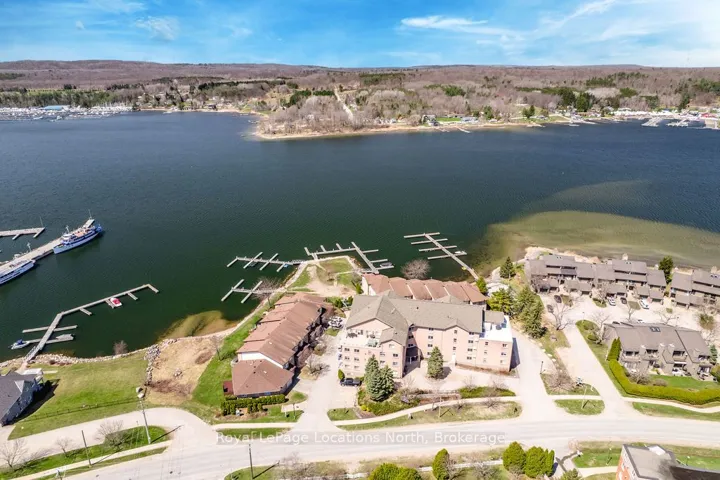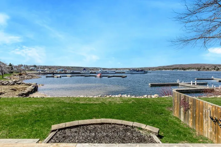 +"PublicRemarks": "DEEDED WATERFRONT HOME WITH PRIVATE BOAT SLIP INCLUDED - rare 30-ft slip with running water and hydro, located in a protected harbour with direct access to Georgian Bay boating. This beautifully updated 3 bedrooms, 2.5 bathrooms waterfront residence offers low-maintenance luxury living with panoramic harbour and bay views.A spacious front foyer provides access to a 2-piece bathroom, oversized closet, and inside entry to the garage. The main level features updated tile flooring throughout and a modernized kitchen with stainless steel appliances, stylish backsplash, updated cabinetry, and solid wood pull-out organizers for everyday functionality. The open-concept living area showcases unobstructed water views, making it ideal for both daily living and entertaining.Step outside to tiered waterfront decks, perfect for morning coffee, sunset dining, and evening entertaining while the harbour lights shimmer at night. The second floor offers three bedrooms with updated flooring, including a 20' x 21' primary suite overlooking the water. The ensuite has been fully updated with a walk-in glass shower, new vanity, granite countertops, and neutral tile, along with a large walk-in closet (40+ sq ft). A second-floor laundry room adds everyday convenience.Recent upgrades include Bryant furnace (2019), hot water on demand, air conditioner (2019), replaced garage door and opener, and attic insulation upgraded to R-60 for improved energy efficiency. Exterior enhancements include a stone entry with railings (2023), new storm door, upgraded entry door with sidelight, patio door with internal blinds, and leaf-guarded eavestroughs (2024) for low-maintenance ownership. Hunter Douglas blinds throughout complete the home.Meticulously maintained and move-in ready, this deeded waterfront property with private marina slip offers a rare combination of modern upgrades, harbour protection, and direct Georgian Bay lifestyle living."