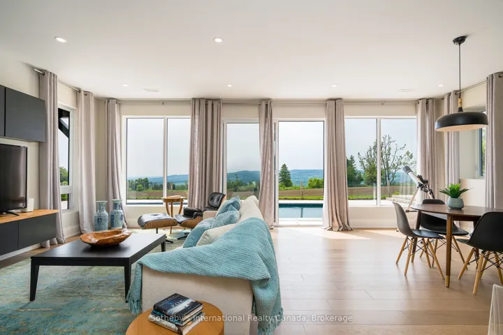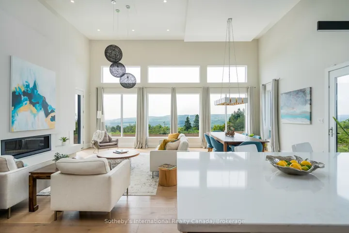 +"PublicRemarks": ""Viewfield" an exceptional three-bedroom home, where you can experience the most stunning sunrise and sunset views. Set on 1.3 professionally landscaped acres outside the vibrant village of Creemore. Tucked at the end of a maple-lined driveway, the home exudes the peaceful elegance of a European retreat. Inside, the bright and airy layout is designed to impress. Oversized windows frame panoramic views of rolling hills and farmland, while the open-concept main floor blends everyday comfort with sophisticated style. The custom walnut kitchen features granite counters, wall oven and cooktop, and a large island with floating shelves perfect for cooking or gathering.In the great room, soaring 16-ft ceilings and a sleek Napoleon fireplace create a dramatic focal point, while the dining areas minimalist chandelier keeps the views front and center. Radiant in floor heating throughout the house is perfect for the cooler fall and winter days. The main-floor primary suite is a tranquil retreat, with a private dressing room, spa-like ensuite, and floor-to-ceiling windows offering abundant natural light. Downstairs, the walkout lower level is perfect for guests or extended stays, with a large family room, wet bar, 3 piece washroom, pantry, and additional storage. Working from home you can find your own space in the lovely office with built in shelving and desk. The 2 guest bedrooms are spacious with one of them having private access to a walk out with views as far as the eye can see. Step outside to a private backyard oasis with a new heated in-ground saltwater pool (2023), surrounded by limestone and concrete patios, mature trees, and a privacy fence. A bonus studio/yoga room with sliding glass doors overlooking the hills of Creemore.With cedar, Eramosa stone, and stucco finishes, the home blends seamlessly into its natural setting. Offering over 3,000 sq ft of finished space plus a large garage. Hundreds of thousands spent since owners have purchased. 5 minutes to Creemore."