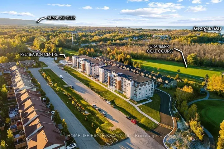 +"PublicRemarks": "The View - this brand new building in the Cranberry Golf Course community doesn't need an introduction. Top-floor unit with breathtaking views of the golf course and Blue Mountain. This 887 sq. ft. suite features 2 spacious bedrooms, 2 full bathrooms, and a large 17' x 8' terrace balcony with glass railings, BBQ gas line, water bib, light fixture, and electrical outlet - ideal for four-season living. The unit offers upgraded flooring in the main living areas, 9-foot ceilings, smooth ceilings in the kitchen and bathrooms, and California knockdown ceilings throughout. The gourmet kitchen includes granite countertops, under-cabinet lighting, an upgraded under-mount stainless steel sink, gas stove, venting microwave, and brand-new appliances. The primary bedroom features a walk-in closet and ensuite with granite countertop, while the second bedroom includes a regular closet and its own ensuite with granite countertop and a glass walk-in shower. Additional features include an oversized attached storage locker next to the entry door and one indoor parking space. Amenities include an outdoor pool, clubhouse, and gym. Enjoy true bungalow-style, one-level living with self-controlled heating and air conditioning, plus an open-air terrace balcony that feels like a private backyard in the sky."