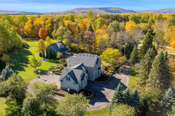 +"PublicRemarks": "Welcome to an extraordinary 14.95-acre country estate that defines luxury living in the heart of Collingwood. Just minutes from downtown yet surrounded by the serenity of nature, this remarkable property offers a harmonious balance of elegance, privacy, and lifestyle - an idyllic retreat for those who value space and sophistication. A picturesque maple-lined driveway winds through the property, leading to a tranquil pond and fountain that set the tone for the residence beyond. The beautifully updated main home spans over 4,300 square feet, featuring 5 bedrooms and 6 bathrooms, thoughtfully reimagined with refined modern finishes. Three fireplaces, dual staircases, and ensuites in every bedroom speak to the home's quality and craftsmanship, while multiple walkouts open seamlessly to expansive terraces, patios, and decks - perfect for entertaining or quiet moments immersed in nature. Every element has been carefully curated, from new windows and floors to the roof, driveway, and professional landscaping, ensuring a timeless and inviting atmosphere. Enhancing the estate's appeal is the 2023-built guest residence, an approved Accessory Dwelling Unit (ADU) by Clearview Township. This 1,800-square-foot home features 2 bedrooms and 2 bathrooms, exuding the same level of luxury and style. Connected to a heated pool and generous deck, it offers endless possibilities - an elegant in-law suite, private guest quarters, or an income-generating retreat for seasonal visitors. The back 10 acres offer private trails that border scenic apple orchards and provide breathtaking views toward Osler Bluff. Mature maples and fruit trees frame the landscape, creating a true four-season sanctuary. Few properties offer such a rare combination of scale, privacy, and proximity to downtown Collingwood. This exceptional estate captures the essence of refined country living - where luxury, nature, and lifestyle meet in perfect harmony."