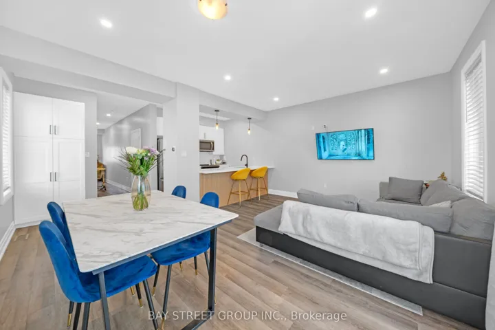 +"PublicRemarks": "5-year-old executive end-unit townhome with 1,497 sq ft plus finished basement in central Barrie, close to top-rated schools, Georgian Mall, recreation centre, shopping, restaurants, and transit. Quality-built home with open-concept layout and 9-ft ceilings on the main floor. Kitchen features upgraded cabinetry, quartz countertops, backsplash, stainless steel appliances, and large centre island. Walkout to private interlocked backyard. Triple-pane windows, hardwood staircase, and upgraded light fixtures. Second floor offers three bedrooms, two bathrooms, and upper-floor laundry. Primary bedroom with walk-in closet, ensuite, and custom built-in wall unit with desk and storage drawers.Finished basement with a large recreation room and a 3-piece bathroom. Well-maintained home in a family-friendly neighbourhood. Pride of ownership. Shows like new. Move-in ready home in a convenient Barrie location close to schools, parks, shopping, and everyday amenities. Freehold townhome with POTL fee covering snow removal and common elements maintenance."
