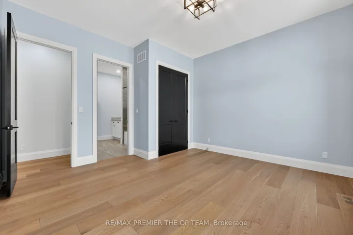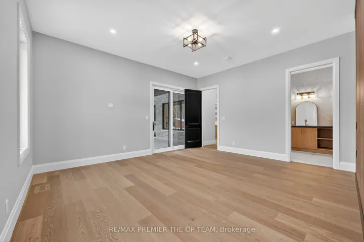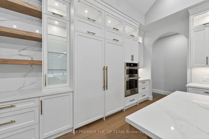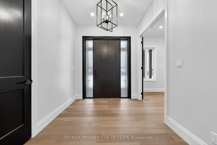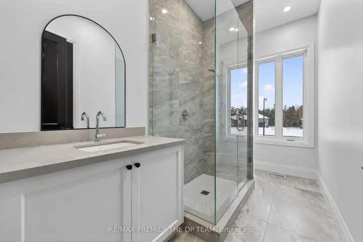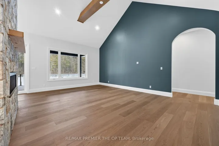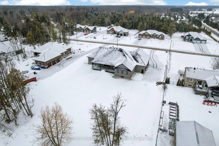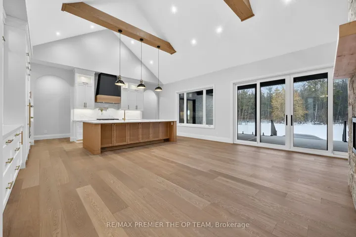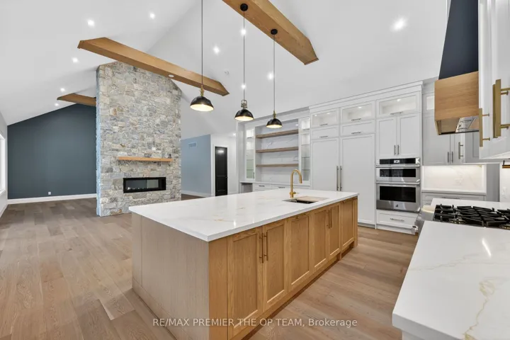 +"PublicRemarks": "New 3,200 sq. ft. custom stone and brick bungalow on over an acre, built by a quality builder and backed by Tarion warranty. This stunning home features wide plank hardwood floors, high-end light fixtures, Jenn Air appliances, and Riobel bathroom fixtures throughout. The open-concept kitchen and living area is highlighted by a massive island, butler's pantry with espresso bar, and a dramatic floor-to-ceiling double-sided stone fireplace, with walkout to a covered back deck overlooking a pool-sized yard and forest backdrop. The principal suite offers a feature wall, walk-through custom closet, and spa-inspired ensuite. Separate bedroom wing with 3 bedrooms and 2 full baths. Main floor laundry and mudroom off the impressive 40' x 30' garage with oversized doors, high ceilings for car lifts, and basement walk-up. Basement features 9 ft ceilings and rough-in for additional bath. Landscaping package includes exposed stone concrete walkway, entrance garden with two trees, sodded front yard, and hydro-seeded backyard. Excellent commuter location with easy access to Barrie and Hwy 400."
