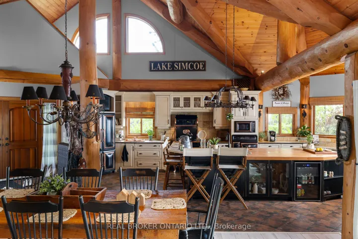 +"PublicRemarks": "Welcome to 'Four Winds', one of Orillia's most exceptional waterfront properties located on Lake Simcoe. Situated on a rare 206 feet of private shoreline, this 2005-built round log home by Moonstone Timberframe with almost 5000 square feet of finished living space, offers timeless craftsmanship, remarkable design, and panoramic lake views from nearly every room. West-facing exposure delivers unforgettable sunsets, while the setting near the narrows connecting Lake Simcoe and Lake Couchiching offers incredible access to the Trent Severn Waterway and year-round enjoyment. Inside, a 30-ft vaulted great room showcases true log construction and stunning stonework around the gas fireplace. The chefs kitchen is a showpiece with an oversized island, high-end Elmira Heritage appliances, and wraparound views of the lake. The main floor primary suite features a 5-piece ensuite, walk-in closet, in-suite laundry, and private access to the expansive glass-railed deck overlooking the lake. Upstairs, a spacious open loft currently functions as a lounge and home office, originally designed to accommodate 2 additional bedrooms and a full bathroom. The fully finished walkout basement includes in-floor heating throughout, an entertainers bar, media room, two large guest bedrooms, full bathroom with laundry hookup, and access to a screened-in porch and covered patio. At the waters edge, a 458 sq ft finished boathouse bunkie with waterfront deck offers additional guest space. The 1,289 sq ft heated garage/workshop easily stores up to a 38-ft boat plus 2 vehicles. On the water, enjoy a 60ft cantilever dock, large observation deck, boat rail system and additional floating dock. Just 10 minutes to Orillia, under an hour to Muskoka, and only an hour from the GTA, this is lakeside living at its absolute finest. See agent website for info, additional photos and floor plans."