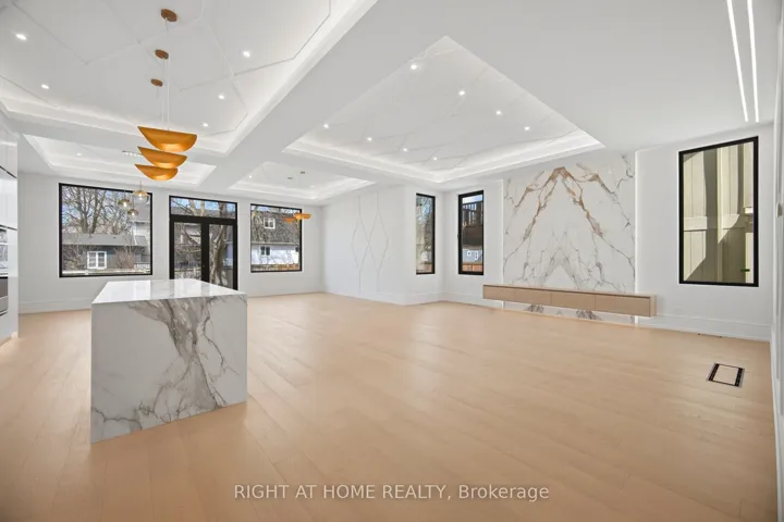 +"PublicRemarks": "Exceptional custom-built residence offering over 3,900 sq. ft. of refined living space on a premium 45 x 125 ft lot in one of Aurora's most prestigious and established neighbourhoods. Designed by a European architect and designer, this home blends timeless exterior character with a sophisticated modern interior.Open-concept main level with soaring 11.5 ft ceilings and 10 ft coffered ceilings in all bedrooms. High-end finishes throughout include a designer kitchen with Jenn Air appliances and built-in wine fridge, custom cabinetry, European triple-pane windows and doors, and a spa-inspired primary ensuite. Heated floors in the basement and all bathrooms.A distinctive design language flows throughout, with refined geometric and hexagonal detailing integrated into feature walls, tilework, fixtures, and hardware. Extensive LED accent lighting enhances architectural features and creates a warm, upscale ambiance. Natural light fills the home through a skylight and sun tunnel.The primary suite offers a private retreat with a Juliet balcony and electric fireplace. Spacious bedrooms, custom millwork, and thoughtfully designed spaces provide both comfort and understated luxury.Beautifully landscaped grounds with approx. 1,000 sq. ft. of interlock, a large deck for entertaining, and a private yard. Double garage with lift potential (4 parking).Prime location directly across from Town Park, with weekend farmers' markets and concerts. Walking distance to GO Station, top-rated schools, library, restaurants, and a modern playground.Fully prepared basement with separate entrance, heated floors, and rough-ins for kitchen and bathroom offers excellent potential for a legal rental or in-law suite."