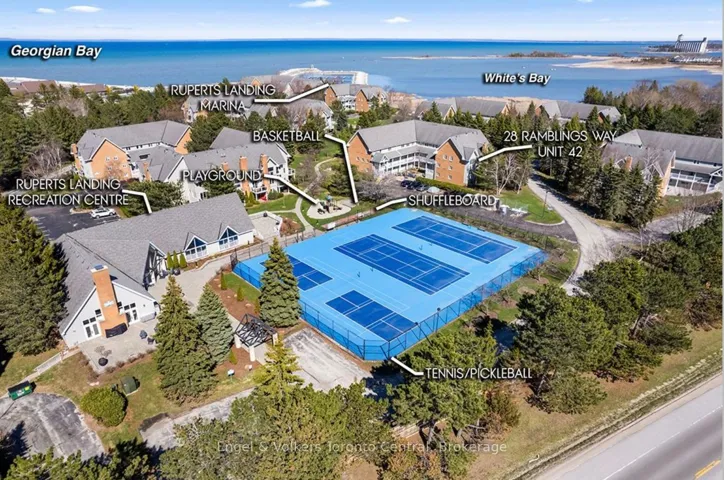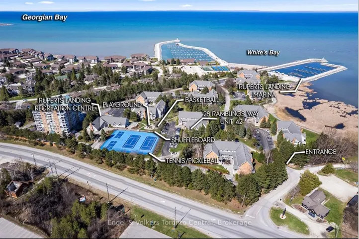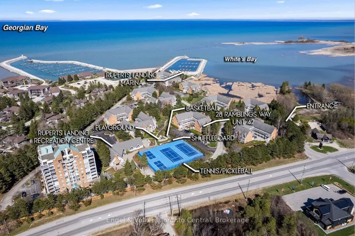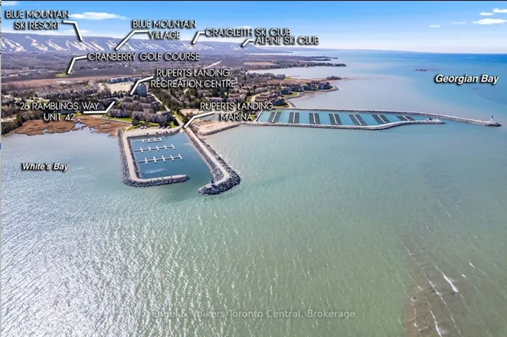 +"PublicRemarks": "Welcome to 42-28 Ramblings Way, Collingwood-an exceptional end-unit townhome in the highly coveted waterfront community of Rupert's Landing. Offering approximately 1,479 sq. ft. of thoughtfully designed living space, this is one of the largest and most desirable end units available, complete with ample parking and two outdoor storage lockers. Bathed in natural light, the main level showcases an inviting open-concept layout, seamlessly connecting the living, dining, and kitchen areas-ideal for both everyday living and entertaining. The spacious living room is anchored by a charming brick-front gas fireplace, while the adjacent dining area flows effortlessly to a private, tree-lined deck featuring a natural gas BBQ hookup-perfect for outdoor gatherings in a serene setting. The modern kitchen is well-appointed with granite countertops and ample cabinetry, offering both style and functionality. A convenient main floor laundry, generous storage space, and a 2-piece powder room complete this level. Upstairs, you'll find three well-proportioned bedrooms, including a spacious primary retreat with its own private balcony and updated 4-piece ensuite. Two additional bedrooms and a beautifully updated main bathroom provide comfortable accommodations for family and guests alike. Rupert's Landing is renowned for its unmatched lifestyle amenities along the shores of Georgian Bay. Residents enjoy access to a private marina, swimming platform, and three tennis courts, pickleball along with a recreation centre featuring an indoor pool, sauna, hot tub, fitness room, and adult lounge. Ideally located just minutes from downtown Collingwood, shopping, dining, and year-round outdoor activities, this property offers the perfect blend of comfort, convenience, and four-season living. Whether you're seeking a full-time residence or a weekend retreat, this is your opportunity to experience the best of Collingwood's waterfront lifestyle. Book your private showing today."