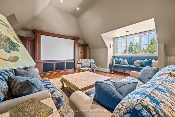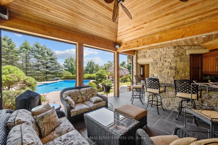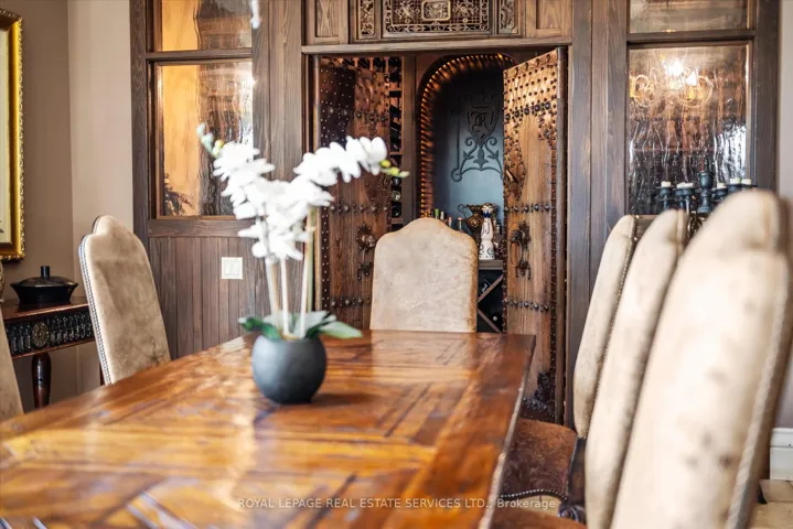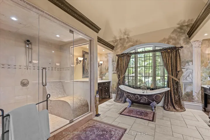 +"PublicRemarks": "STONEGATE MANOR - AN ARCHITECTURAL MASTERPIECE! Nestled on 2.5 acres of manicured grounds behind private gates in prestigious Whispering Pines Estates, Stonegate Manor is a palatial estate crafted by an award-winning builder. A picturesque pond with fountain greets you at the foot of the driveway, setting the tone for timeless French Manor-inspired elegance. A grand foyer with 17.5-foot cathedral ceiling and hand-painted mural opens to a living room with 18-foot vaulted ceiling, two-storey cherrywood gas fireplace and expansive windows flooding the space with natural light. The chefs kitchen features a 48" Wolf gas range, Sub-Zero fridge, Miele dishwasher, servery, and three sets of French doors opening to a private courtyard. The formal dining room connects to a wine cellar with antique Asian doors, while a private office with 15-foot vaulted ceiling, gas fireplace and built-ins offers a refined workspace. The luxurious primary suite boasts a 14-foot vaulted ceiling, courtyard walkout, gas fireplace, walk-in closet, gym, and spa-inspired 7-piece ensuite with clawfoot tub and steam shower with built-in chaise. A lofted entertainment area features a 14-foot vaulted ceiling, wet bar, pool table, theatre setup, and powder room. The finished lower level includes heated floors, full kitchen, 3 bedrooms, 2 baths, and walkout to a private patio - ideal for multi-generational living. Resort-style amenities include an inground saltwater pool with integrated hot tub, standalone hot tub, koi pond, and an additional pond with fountain. The cabana features a wood-burning fireplace, kitchen, seating, automatic mosquito screens, 2-piece powder room, and change room. Additional highlights: elevator to all levels, Crestron Home Automation, oversized 3-car garage, and new concrete/asphalt driveway. A rare offering of elegance and lifestyle - just minutes north of Campbellville!"