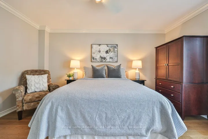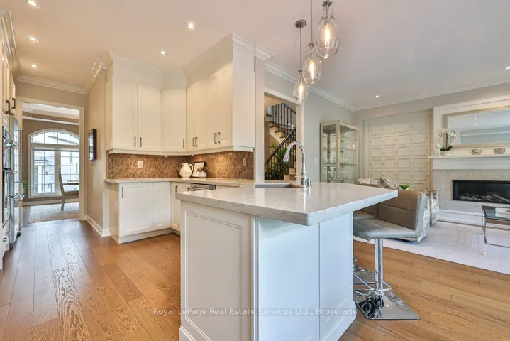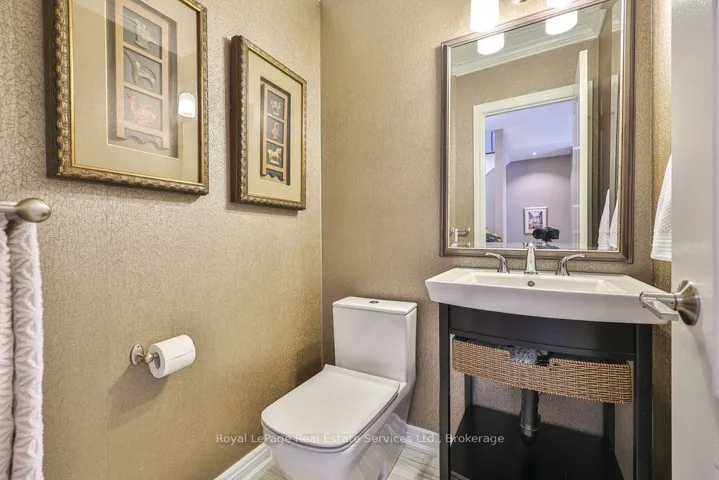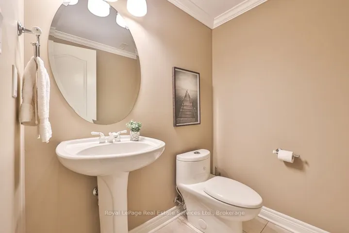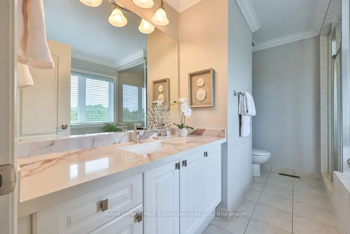 +"PublicRemarks": "Updated & turn-key executive townhome backing onto greenspace and pond with no rear neighbours. Winding Creek Cove is a private community surrounded by ravines, ponds & greenspace. Steps to the 16 Mile Creek park and trail network. Extensive upgrade list available via virtual tour & attachments. Timeless curb appeal with stone and stucco exterior & manicured gardens. Bright foyer with high ceilings, modern light fixture, double closet and front door with stained glass, sidelights and transom window. Pot lighting & upgraded light fixtures throughout. Living room boasts hardwood, crown moulding, and designer feature wall with Valor gas fireplace with quartz surround. Custom kitchen with Stainless steel Kitchenaid appliances, pendant lighting, custom cabinets, backsplash, quartz counters and large peninsula with bar seating. Adjacent breakfast room with hardwood and walkout to deck overlooking pond and greenspace. Butlers pantry from kitchen leads to dining room with sconce lighting, arched transom-style picture windows, coffered ceiling and crown moulding. Wood stairs with runner and banister with metal spindles and overhead skylight lead you to the upper level. Primary bedroom features two walk-in closets, wall of built-in closets and pond views. Unwind in the 4pc ensuite with quartz counter vanity, separate tub & separate shower overlooking greenspace. Two additional large bedrooms, main bath and convenient laundry room on upper level. Above grade lower level with bright rec room with high ceilings, California shutters, and walk-out to back patio. Lower level also features inside entry from the garage & 2 pc bath. Double wide driveway and garage (parking for 6 cars total). Eaves with leaf guards. Exceptional location with easy access to hospital, shopping, golf, restaurants, and steps to the 16 Mile Creek trails. Upgrade list attached & via virtual tour link."