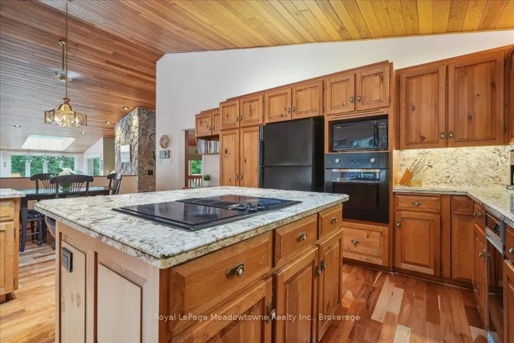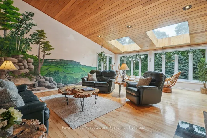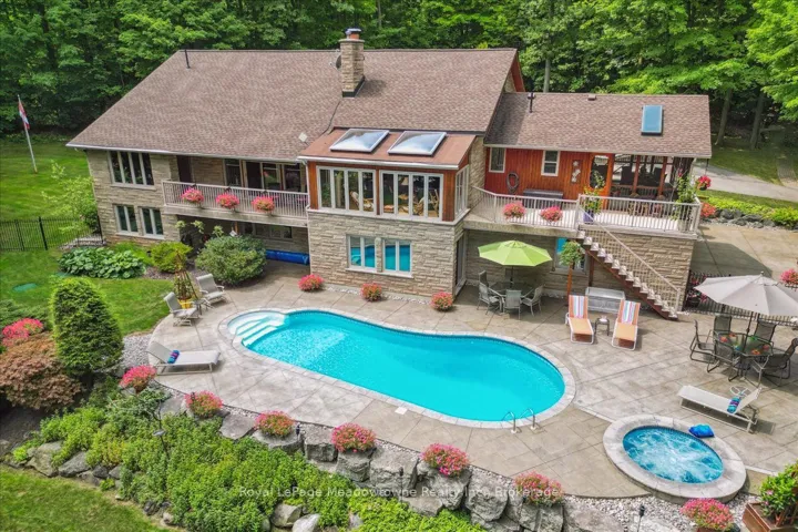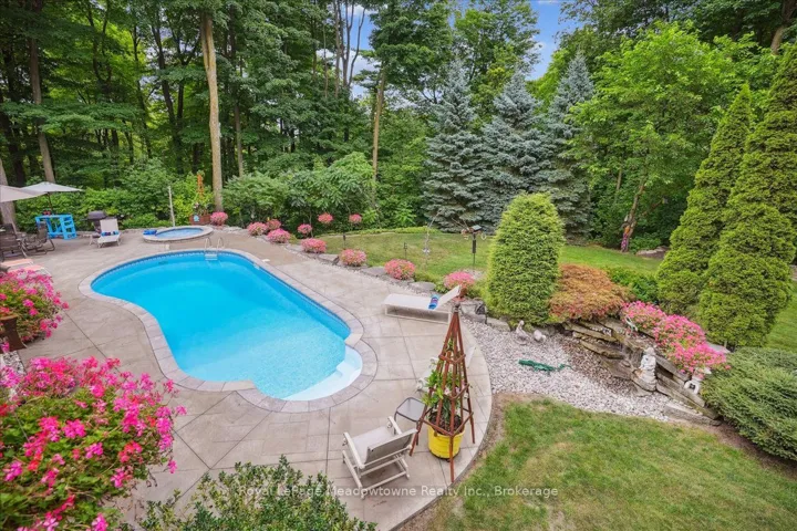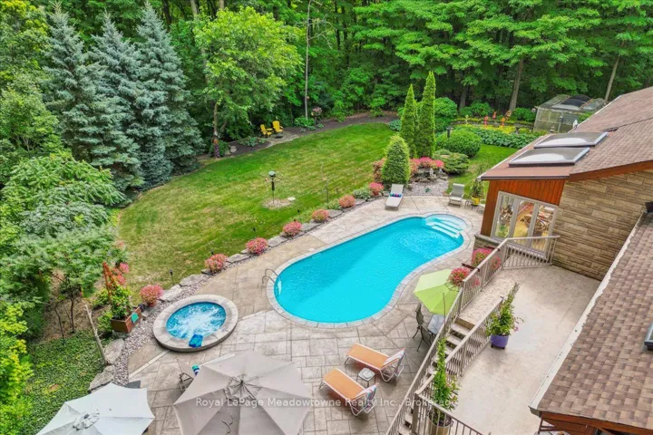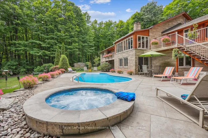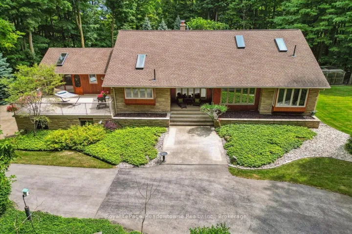 +"PublicRemarks": "Discover an unparalleled gem rarely available on the market: a private and serene estate with a custom-designed home that fulfills every dream. Set on over 10 lush acres amidst the stunning Niagara Escarpment, this meticulously cared-for property is just minutes from the 401 and downtown Milton. Surrounded by vibrant perennial gardens and towering mature trees, this home is perfectly positioned in the heart of Halton Conservation's premier parks. You'll be just moments from Kelso Conservation Area, Rattlesnake Point, Crawford Lake, Hilton Falls, and the Bruce Trail ideal for outdoor enthusiasts and nature lovers. The custom-built bungalow features over 6,000 sq. ft. of exquisite living space. Its open-concept design showcases vaulted ceilings, a double-sided stone fireplace, a spacious kitchen with pine cabinets, granite countertops, and an island. A convenient wet bar, elegant dining room, and a fantastic outdoor screen room offers the perfect space for 3-season entertaining. Enjoy stunning views from walkout decks off the kitchen, screen room, sun room, and master bedroom balcony. The lower level is a haven of relaxation and recreation. You will find a large recreation room with a cozy wood-burning stove, a games room, four additional bedrooms, and access to a three-car garage. Walk out to a luxurious inground pool with a hot tub, cabana, and a soothing water feature. The home is equipped with a 400-amp electrical service, a propane-powered generator, and a geothermal heating and cooling system. A separate two-car garage provides the ideal "Man Cave" and additional storage for garden equipment. Garden enthusiasts will love the large greenhouse/potting shed, and the property boasts a fire pit with a patio area, night landscape lighting, and over one kilometer of meticulously groomed walking trails. Why settle for a cottage when you can have this dream home without the drive? Experience the ultimate in luxury and tranquility this is truly what dreams are made of!"
