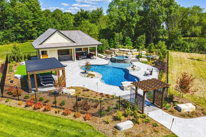 +"PublicRemarks": "AMAZING! Custom Bungaloft nestled on a spectacular 12-acre property in Burlington. Featuring 5+1 bedrooms, 6 full bathrooms and 2 half baths with an attached triple car garage AND detached double car garage with storage loft! Boasting over 5,400 square feet PLUS an additional 4,300 square feet in the finished lower level. Resort-style exterior with a pool, hot tub, pond, cabana, outdoor kitchen, full bar, built in BBQ area, golf green, two firepits, a fireplace and 5+ forested acres! The main floor offers DUAL primary bedrooms- each with ensuite baths and large walk-in closets. There is also a main floor office and oversized dining room. The kitchen features a large island, stainless steel appliances and a walk-in pantry. The kitchen is open to the living room- which features 12' ceilings and a stunning wood burning fireplace. There is also an oversized mudroom / laundry room with garage access and two powder rooms. The 2nd level of the home includes 3 large bedrooms and a 5-piece bathroom. The lower level (accessible by stairs OR elevator) features an amazing rec/family room, 6th bedroom, second kitchen, 2 full bathrooms, a wine cellar, gym, sauna, wet bar and plenty of storage! This home was custom built by Glen Oak Homes in 2016 and a main floor addition with full basement was added in 2024. The entire property was fully landscaped in 2023/2024. Interior and exterior 'smart' features throughout, highly efficient and fully private- a true paradise. Luxury Certified"
