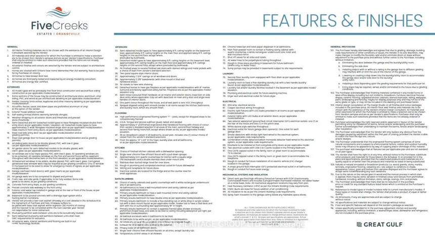 +"PublicRemarks": "Offered by the Builder. Welcome to Five Creeks by Great Gulf - where luxury, nature, and modern living come together. This brand-new Fendley Model (Elevation B) sits on a premium ravine lot with a walkout to deck, offering sweeping natural views and the rare opportunity for a walkout basement. Designed with over 2,230 sq ft of elegant living space, this 4-bedroom, 4-bath detached home showcases 9-ft ceilings, an inviting gas fireplace, and sun-filled, open-concept living areas that seamlessly connect to the outdoors. The chef-inspired kitchen boasts quartz countertops, extended cabinetry, a stainless range hood, and a bright breakfast area with a convenient walk-in pantry and walkout to the deck overlooking the ravine - perfect for family gatherings or morning coffee. Upstairs, the primary retreat features his and hers walk-in closets, a freestanding tub, glass-enclosed shower, and double-sink vanity. Each secondary bedroom offers generous space, ensuite or semi-ensuite access, and walk-in closets - ideal for growing families. Built by one of Canada's most award-winning builders, Great Gulf, this home delivers quality craftsmanship and energy efficiency at every turn: triple-pane Energy Star windows, HRV air system, 200 AMP electrical service, rough-in EV charger, and full Tarion warranty for lasting peace of mind. Experience the privacy and tranquility of ravine living in Orangeville's newest master-planned community, just minutes from schools, shopping, and major highways. Walkout, finished basement available. A rare chance to own a luxury new-build backing onto nature - where every detail enhances comfort, connection, and lifestyle."