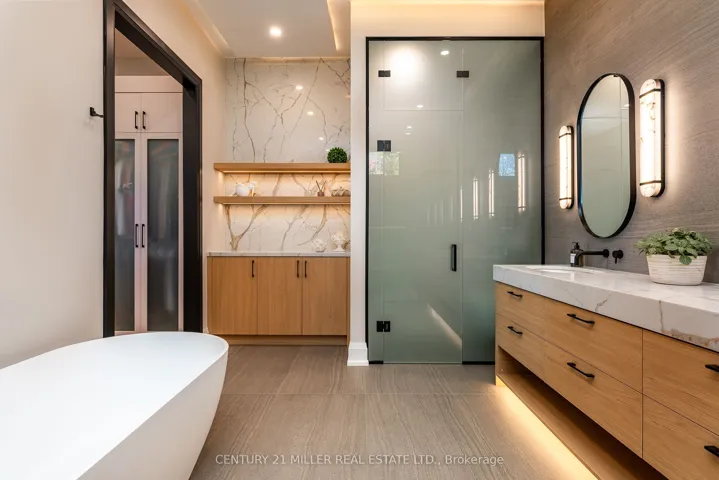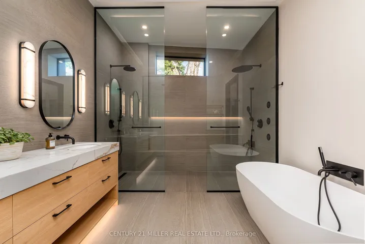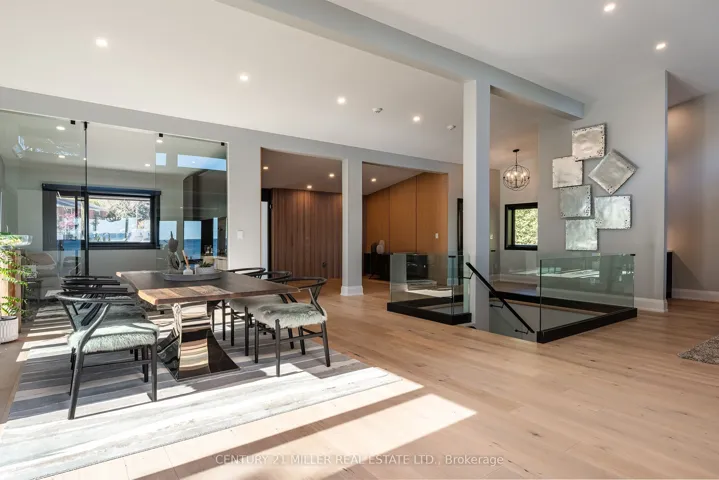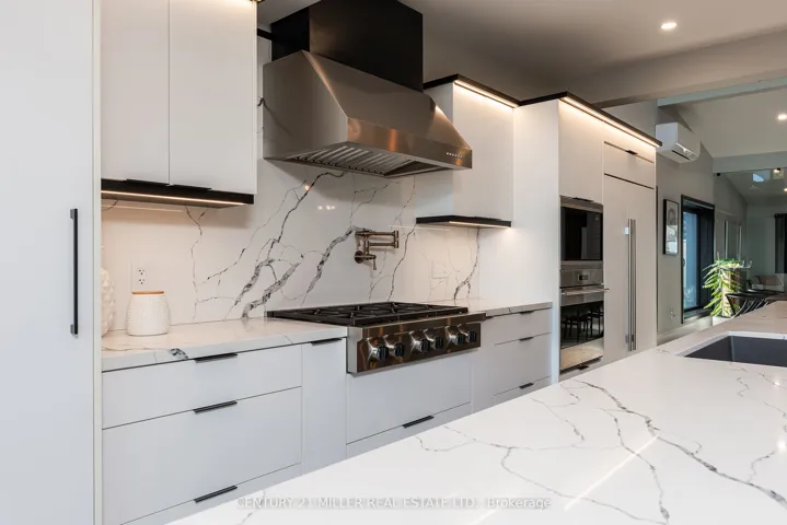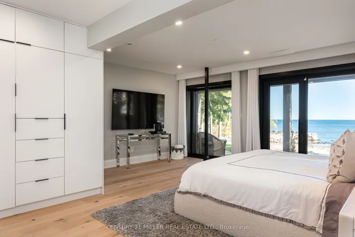 +"PublicRemarks": "Natural serenity meets modern design at 121 Edgecliffe Place. Set on a rare 29,000 sq. ft. pie-shaped lakefront lot where Appleby Creek meets Lake Ontario, this exceptional property offers 105 feet of direct waterfront and 130 feet along the creek with riparian rights, creating an irreplaceable natural setting in the city. This fully renovated home offers over 5,200 sq. ft. of finished living space with floor-to-ceiling windows that draw the lake and landscape into every room. The open-concept main level features 12-foot peaked ceilings, engineered light hardwood, and dark-framed windows that frame panoramic southern views. A chef's kitchen anchors the space with a large island and top-tier appliances, ideal for entertaining. The walkout lower level accommodates four bedrooms, each with its own ensuite and ductless air conditioning unit. The primary suite opens directly to the lakeside deck, featuring a spa-inspired ensuite with dual rain showers and a massive walk-in closet with custom cabinetry. Radiant in-floor heating extends throughout the home for year-round comfort. Multiple outdoor living spaces blur the line between indoors and out. A covered lower deck and expansive upper terrace with built-in BBQ maximize lakefront enjoyment and capture the home's stunning setting. Modern. Peaceful. One of a kind on the water."