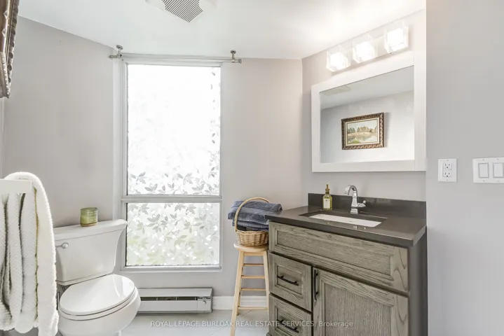 +"PublicRemarks": "Welcome to this bright and spacious 2-bedroom, 2-bath corner suite offering over 1,300 sq. ft. of comfortable living space, perfect for downsizing, with stunning south-facing views of Lake Ontario from every window. This beautifully updated condo features a split-bedroom layout for added privacy, engineered hardwood flooring throughout, and 2x2 porcelain tiles in the kitchen, bathroom, and laundry. Enjoy electronic blinds in the kitchen and second bedroom for added convenience. The spacious living room opens to a large south-facing balcony through four panel sliding patio doors, seamlessly blending indoor and outdoor living and flooding the space with natural light. The modern eat-in kitchen is a chef's dream, showcasing gleaming white push-touch cabinets, pot lights, under-mount cabinet lighting, and all stainless steel appliances, including an induction stove, fridge with ice maker and water dispenser, Miele dishwasher, and a reverse osmosis system. The primary suite offers a cozy sitting area, walk-in closet, and 4-pieceensuite. The second bedroom is also generously sized with a semi-ensuite 3-piece bath. A separate laundry room includes a Miele side-by-side washer and ventless dryer with plenty of storage space. Includes two parking spots and a locker, plus access to exceptional building amenities: a heated outdoor pool, tennis court, gym, library, social room, workshop, and an indoor carwash bay. Ideally located steps to downtown Burlington, waterfront trails, beaches, restaurants, shopping, and across from Joseph Brant Hospital. Convenient access to the QEW, 403, 407, and three GO Stations makes commuting a breeze. Make 809-1201 North Shore your Home!!"