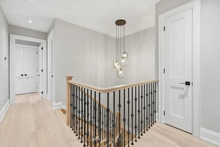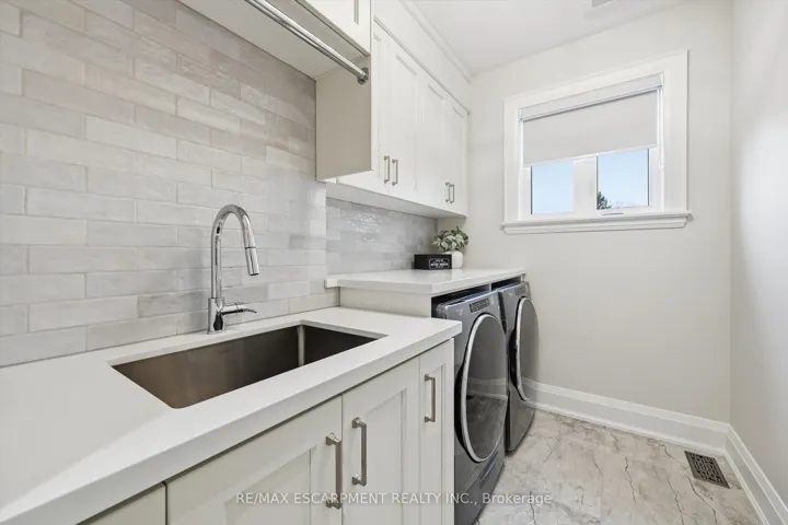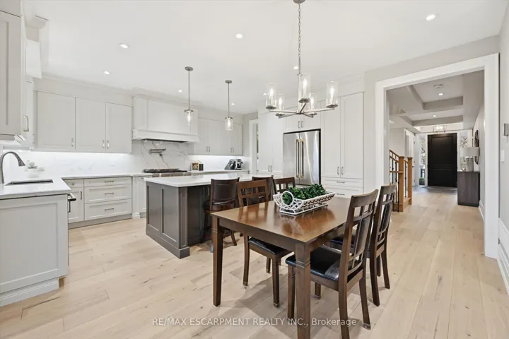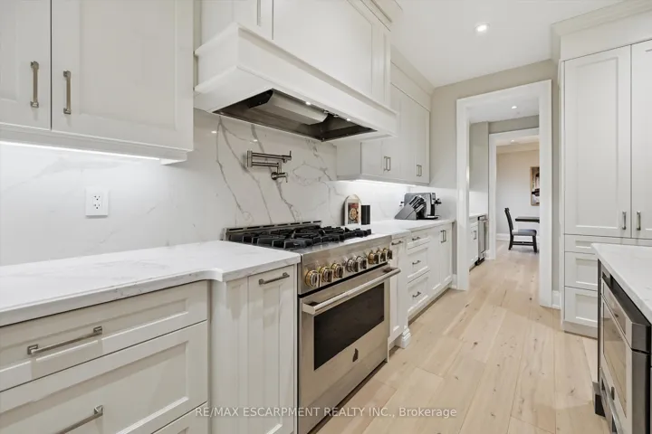 +"PublicRemarks": "Thoughtfully designed home built in 2023 boasting quality finishes & luxurious perks throughout! Set on a large lot in sought-after central Burlington, this home has 9' ceilings, 8' high doorways and beautiful hardwood throughout. The chef's kitchen is loaded with custom cabinetry, beveled quartz counters, a large island, high-end stainless steel Jenn-Air appliances, a Grohe pot filler and fixtures, and crown molding. A servery between the kitchen and formal dining room is equipped with a wine fridge, and perfect for large dinners an entertaining. An inviting breakfast area walks out to the 20'x10' covered porch, finished with stylish a red cedar ceiling, stone-faced post bases, a gas bbq hook-up, and all wired for sound. The living room is spacious and features a gorgeous marble slab with gas fireplace, built in cabinets, pot lights and sound. On the upper level, four generous bedrooms all have their own ensuite baths and walk-in closets. Unwind in your primary bedroom features 3 large windows, a coffered ceiling, a walk-in closet with organizer, plus an additional closet, and a spa-like ensuite with glass shower and soaker tub. Almost 4,000 square feet of living space ready to call home. Quality craftmanship built 100% new from ground up. Additional features include: kick sweep in kitchen, mudroom with built in cabinetry, main floor office/den, bedroom level laundry, 2 wine/cold cellars under the front and rear porches, 6-camdera security system, dual-zone HE furnace, air exchanger, lawn sprinkler, 200amp service, and much more! Luxury Certified."