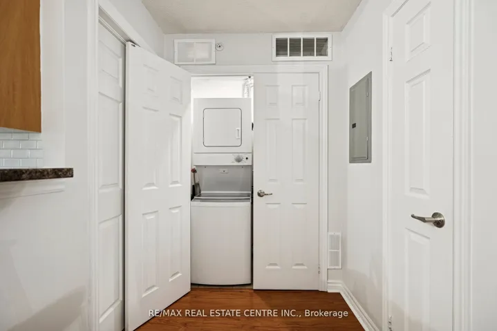 +"PublicRemarks": "This beautiful top-floor one-bedroom + den condo feels open and airy with its cathedral ceilings and upgraded laminate floors. The kitchen is family sized, with stainless steel appliances, a breakfast bar, and plenty of space for cooking and storage. The living and dining area flows nicely to a large balcony. Large primary bedroom plus a separate den that's ideal for a home office/baby room, and your own in-suite laundry. No-carpet. There's also a storage locker for your extras. Located on the quiet side of the building, close to the elevator, this home is in an excellent school district and offers quick access to the 401, GO Station, Art Centre, Community Recreation, Library, Cineplex, Grocery stores and nearby shops. A perfect spot for anyone looking for peace, practicality, and a great location - all in one."