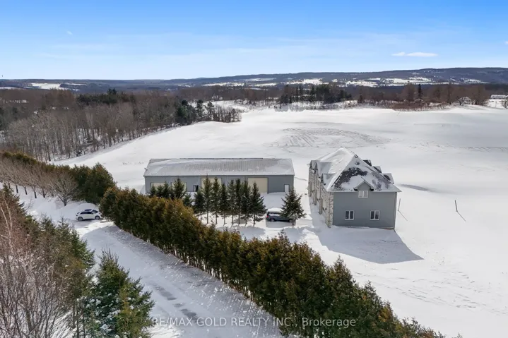 +"PublicRemarks": "Welcome to 3722 The Grange Side Road, an exceptional 84-acre country estate offering a rare blend of privacy, natural beauty, and outstanding versatility. A long, tree-lined driveway winds through picturesque farmland, leading to an impressive natural stone bungalow perfectly positioned to capture sweeping rural views. The property comprises approximately 84 acres, including about 55 workable acres of gently rolling land, complemented by a tranquil pond near the entrance. This setting is ideal for agriculture, a home-based business, or multigenerational living. The main residence showcases quality craftsmanship with spacious, well-appointed interiors and a flexible layout offering three potential living areas, making it well suited for extended family arrangements or adaptable use. A standout feature is the detached stone-fronted, steel-clad workshop/garage, complete with three oversized 12-foot bay doors, a full four-piece bathroom, and an expansive 2,200 sq ft upper-level loft featuring three additional bedrooms and two bathrooms. An additional steel garage with four oversized doors and a secondary workshop/shed further enhance the property's functionality. Whether you are an entrepreneur seeking space for a business, a hobbyist requiring ample storage, or a family looking for room to grow, this estate offers unmatched flexibility. The land presents endless opportunities for farming, recreation, or future expansion. Set in a peaceful rural location while remaining within a convenient drive to nearby towns and amenities, this is a truly signature property that seamlessly combines natural beauty with practical, adaptable living."
