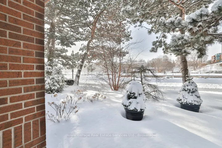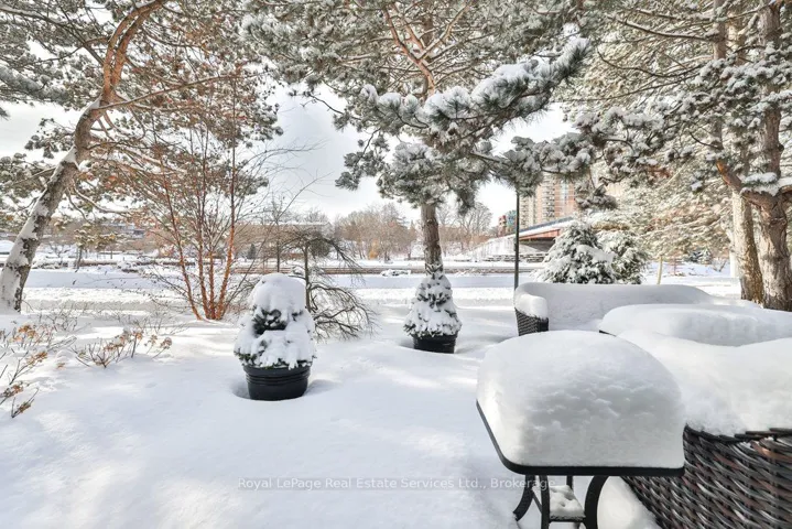 +"PublicRemarks": "One of a kind, extensively renovated, large (1710 sqft) 2 bed, 2 bath ground level unit featuring river & harbour views and an approximately 40' wide garden terrace, providing 600-640sqft of outdoor living space surrounded by newly landscaped gardens. Located in the prestigious Granary building, nestled against the 16 Mile creek & steps to Lake Ontario, The Oakville Club, restaurants, cafes, shops & parks! An oasis on the water in Downtown Oakville! Renovated head-to-toe, with hardwood, shaker style doors with black matte hardware, oversized baseboards, contemporary lighting & freshly painted throughout. High-end kitchen featuring quartz counters, stainless steel appliances (LG fridge, stove, B/I microwave/range hood, Bosch Dishwasher, Frigidaire wine fridge), custom cabinetry with undermount lighting & glass door cabinets with integrated lighting. The kitchen flows into the dining room that boasts integrated cove lighting and a contemporary chandelier. The dining room opens to the living room that features a built-in Continental electric fireplace with custom shiplap mantle and built-in shelving. Custom bench seating underneath a large window with river & harbour views is another highlight. Wall-to-wall glass double door walkout to a sprawling garden terrace with two outdoor dining areas surrounded by newly landscaped gardens, trees & river views. The primary bedroom boasts a walkout to terrace, walk-through closets with custom organizers & ensuite bath. Lux ensuite bath features slate tile, wall-to-wall vanity with walk-in oversized glass shower with rain shower head & bench seating. The second bedroom features a walkout to the terrace, and a walk-in closet. The main bathroom includes oversized slate tile flooring, and glass enclosed shower with subway tile and shower head with wand. Ensuite laundry room with LG stackable washer & dryer, extra storage & sink. Parking spot & large locker (approx 8x10). Completely turnkey, in the right location! Perfect!"