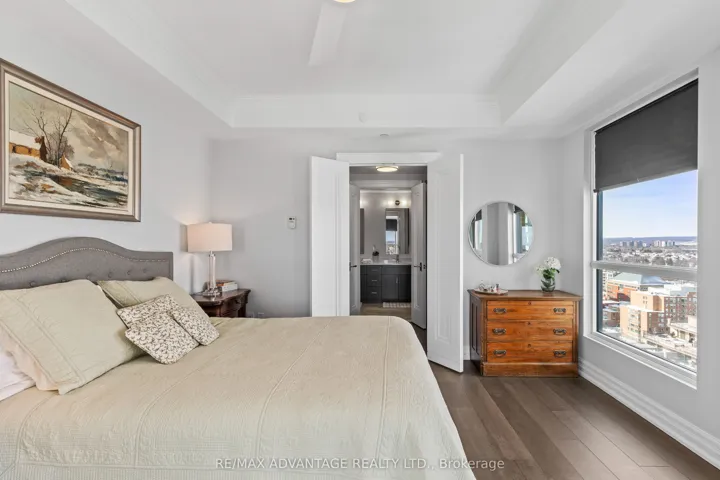 +"PublicRemarks": "Enjoy luxury living at Bridgewater Private Residences on the lake in downtown Burlington. This 1571 square foot, 2 bedroom plus den corner suite has two private balconies, one with a gas line for a barbecue. The spacious living room and dining room feature a custom coffered ceiling and floor to ceiling windows overlooking sweeping views of Lake Ontario and the Burlington-Toronto skyline. The kitchen is equipped with Thermidor appliances, a large island and upgraded cabinetry, countertops and backsplash. The master bedroom offers a walk-in-closet and a spacious bathroom with heated floors. The comfortable den, the second bedroom and bathroom, a spacious utility cupboard, and in suite laundry facility complete the unit. Also included are 2 parking spaces and a storage locker. Residents enjoy many amenities including a large 8th floor terrace with barbecues, two fitness centres, an indoor pool and spa, bike storage, valet visitor parking, a large party room with billiards and a piano, monthly social events, and direct access to the Pearle Hotel, Isabelle restaurant, and Pearle Café. Bridgewater Private Residences offers downtown living on the lake, combined with convenient access to highways and Burlington GO facilities, the perfect blend of elegance and convenience."