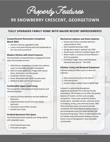 +"PublicRemarks": "Located in a welcoming Georgetown neighbourhood, 99 Snowberry Cres offers an ideal balance of modern comfort and everyday convenience. Enjoy quiet residential streets, nearby parks, reputable schools, and easy access to shopping, dining, and commuter routes. Scenic walking trails wind through nearby ravines and natural green space, while Highway 401 is approximately a 20 minute drive away for easy commuting. The neighbourhood features a strong sense of community, with excellent schools, a local community centre with an indoor pool, and everyday shops all within walking distance. With extensive recent renovations already completed, this turnkey home allows buyers to move in and immediately enjoy stylish finishes, functional living space, and a private backyard retreat. Please refer to the feature sheet in the photos for a full list of upgrades. This is an outstanding opportunity for families and professionals seeking a move-in-ready home in one of Georgetown's most desirable communities."