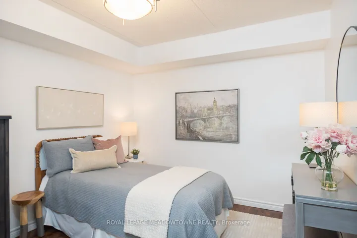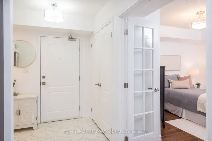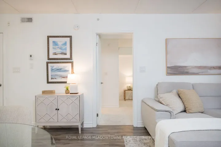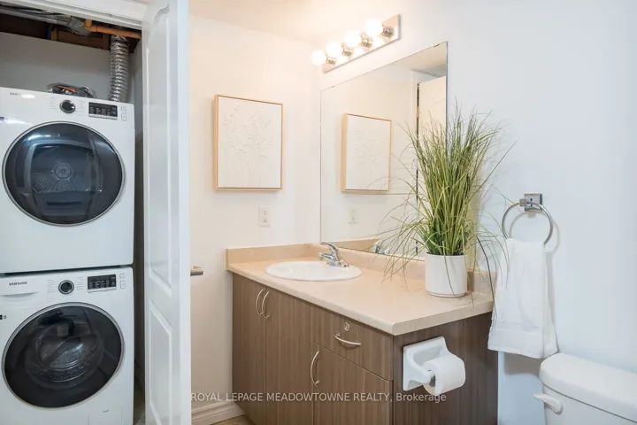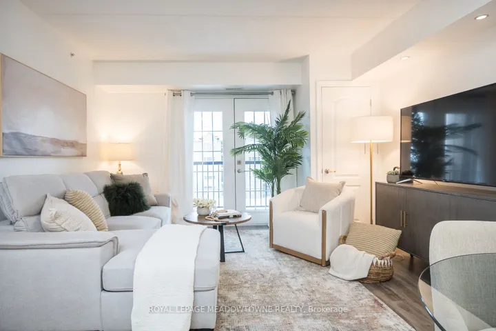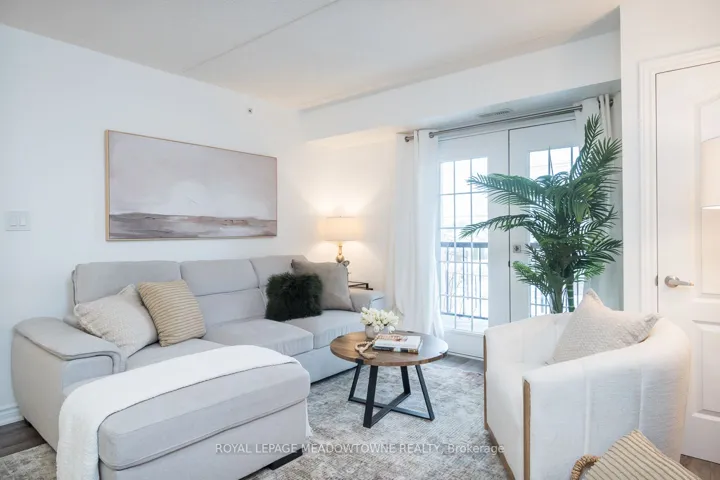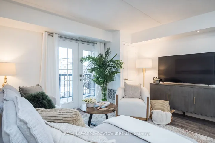 +"PublicRemarks": "This stylish condo at Courtyards on Main offers an uncommon blend of space and practicality - approximately 920 sq ft of thoughtfully designed living space, a spacious balcony, two bathrooms and 2 car parking...definitely a rare find! The bright open-concept design features a modern kitchen with quartz countertops, white subway tile backsplash, stainless steel appliances, and a breakfast bar, with direct access from the living space to the balcony for seamless indoor-outdoor living. The open living and dining area showcases laminate flooring, upgraded lighting, and a neutral palette throughout. The generously sized primary bedroom includes a walk-in closet and private 4-piece ensuite. A separate den with French doors offers true flexibility as a home office or guest space, while the added 2-piece powder room provides everyday convenience rarely found in this category. Complete with in-suite laundry and ideally located within walking distance to parks, schools, and everyday amenities, with quick access to Highways 401 and 407 - this is condo living without compromise."