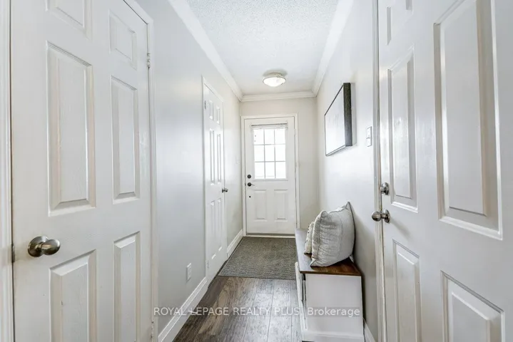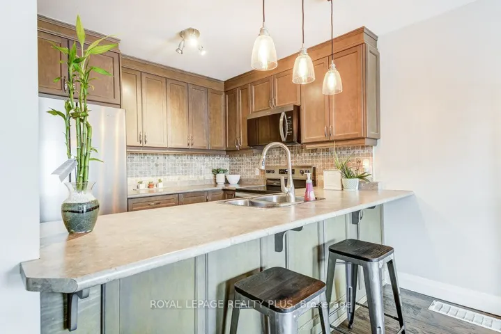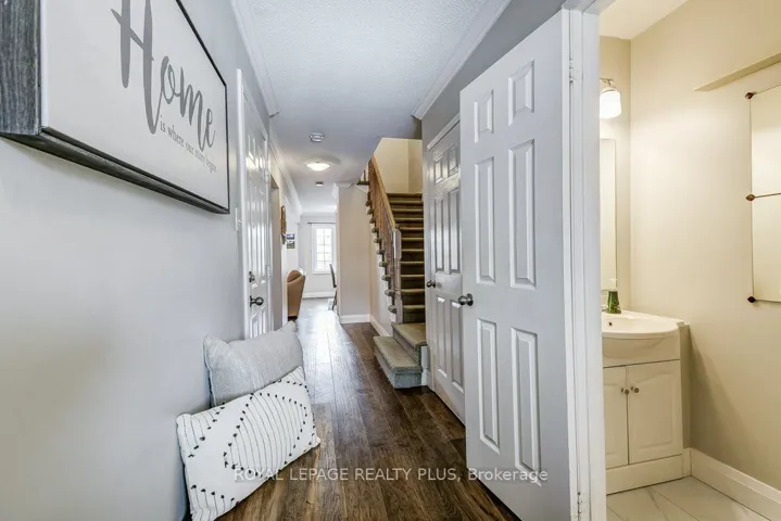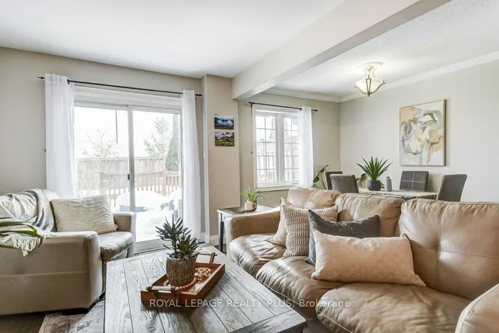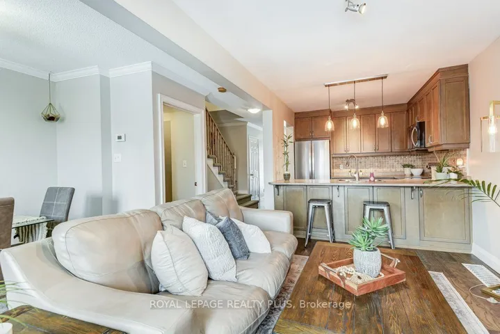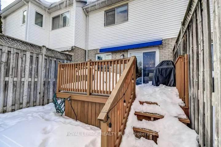 +"PublicRemarks": "Gorgeous Sun-Filled Townhome with No Rear Neighbours! Welcome to this beautifully updated, move-in-ready townhome offering bright open-concept living and exceptional functionality. The renovated kitchen features a breakfast bar overlooking the spacious living and dining areas - perfect for entertaining or everyday family life. Convenient direct garage entry adds everyday ease.Hardwood flooring runs throughout the kitchen, living room, dining room, and all bedrooms, creating a warm, cohesive feel throughout the main and upper levels.Upstairs, the spacious primary bedroom features his & hers closets. One secondary bedroom includes a built-in closet organizer, while the third bedroom offers generous space ready for your personal touch - ideal for families, guests, or a dedicated home office.The professionally finished basement expands your living space with a stylish rec room featuring tile and laminate flooring, a modern 3-piece bath, and ample storage.Step outside to your private, south-facing backyard oasis complete with a fabulous deck, retractable awning, brand new turf, and fresh wooden flower beds - creating a low-maintenance, beautifully landscaped retreat. With no rear neighbours, you'll enjoy added privacy year-round.Major updates include: new flooring (2022), new fridge, stove & microwave (2026), dishwasher (2024), furnace (2025), roof (2012), and deck (2013). Two-car driveway parking. Located close to highways, schools, parks, and shopping, this home checks all the boxes for comfort, convenience, and value."