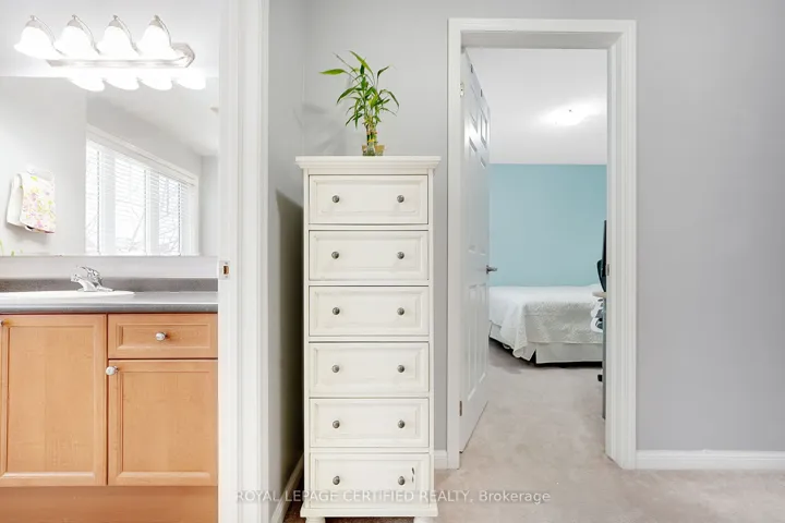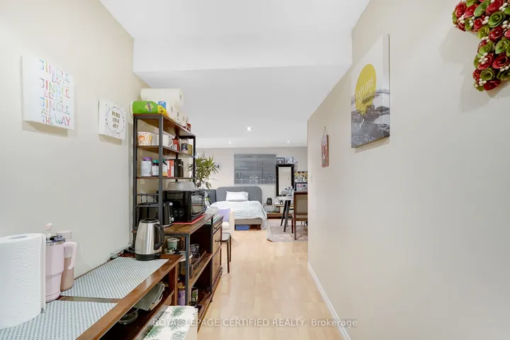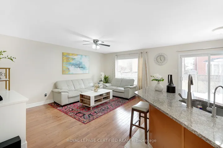 +"PublicRemarks": "Like-new end-unit townhome built by Treasure Hill, featuring thousands of dollars in upgrades throughout. Carpet-free with laminate and vinyl flooring, this home offers interior and exterior pot lights and a fully upgraded kitchen with quartz countertops and an abundance of cabinetry. The well-designed layout includes 3 spacious bedrooms, 3.5 bathrooms, an upper-level office/den, and a primary bedroom with his and hers walk-in closets. The finished basement adds exceptional value with a full bathroom, wet bar featuring quartz counters, a beverage fridge, and a second dishwasher-ideal for entertaining or extended living. The end-unit design allows for the potential of a secondary suite with a side entrance. Additional highlights include 9 ft ceilings, multiple work-from-home office spaces, stainless steel appliances, open backyard views, and enhanced security with three exterior cameras. The property features an extended driveway with no sidewalk, offering parking for up to three vehicles (one in the garage, two on the driveway).Premium upgrades include an owned RO water system, owned Whirlpool water softener, central vacuum, Ecobee digital thermostat. Conveniently located close to parks, schools, Highway 410, and the Southfields Community Centre-this home offers an exceptional layout and outstanding functionality for modern living."