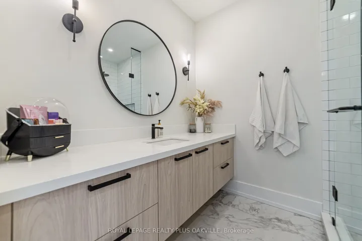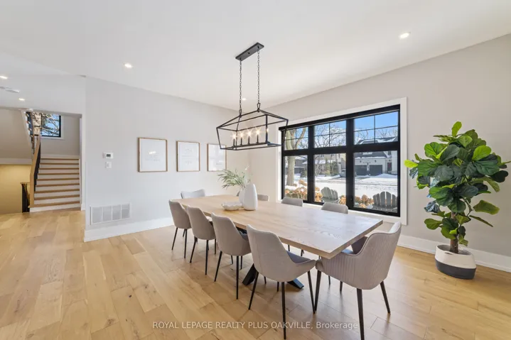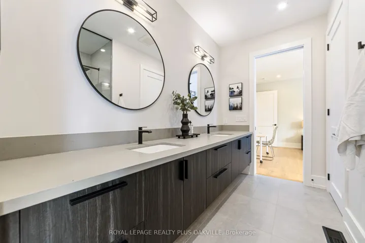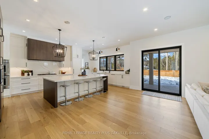 +"PublicRemarks": "Stunning custom Modern Farmhouse (2022/2023) set on an expansive 85 x 133 ft lot on a quiet, family-friendly street just steps to the lake, Bronte Harbour, and Coronation Park. This exceptional residence blends sophisticated design with premium finishes and state-of-the-art functionality throughout. The open-concept main floor showcases soaring 10 ft ceilings, integrated ceiling speakers, designer farmhouse lighting, and automatic shutters. Sun-filled dining room with accent wall flows seamlessly into a showpiece chef's kitchen featuring Thermador appliances, dual wall ovens, 36" cooktop, integrated fridge, built-in coffee maker, dishwasher, and a Gaganeau wine fridge with 150-bottle capacity. The oversized island with custom storage and microwave drawer is complemented by a fully outfitted walk-in pantry with bespoke cabinetry and full-size stand-alone freezer. The family room is anchored by a dramatic three-sided 60" Napoleon glass fireplace with custom millwork. A private office, two elegant powder rooms, & a custom mudroom with backyard access complete the level. Upstairs offers 9 ft ceilings, skylit hallways, and four spacious bedrooms with walk-in closets and automatic shutters. The luxurious primary suite features custom barn doors, an expansive 12' x 11' dressing room, and a spa-inspired 5-pc ensuite. Two additional bathrooms, including a Jack & Jill, and a well-appointed laundry room provide exceptional convenience. The finished lower level adds approx. 1,500 sq ft of finished space with a gym, 5th bedroom, full bath, and recreation space with built-ins. Advanced HVAC, smart home integration, and ample storage complete the space. The private backyard oasis features a full-width covered living area with gas fireplace and outdoor kitchen with gas BBQ, heated saltwater pool with built-in bench, hot tub, cabana, professional landscaping, lighting, and irrigation. A heated, professionally finished double garage with Tesla charger completes this remarkable home."
