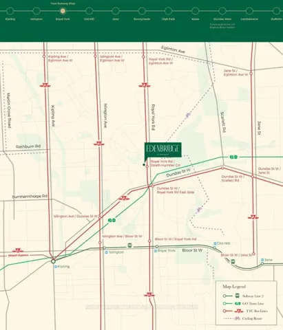 +"PublicRemarks": "**WITH PARKING & LOCKER **Welcome to Edenbridge on the Kingsway, where refined design meets boutique-style living in the prestigious Edenbridge-Humber Valley community. This brand-new 2-bedroom, 2-bathroom suite offers approximately 818 sq. ft. of thoughtfully designed interior space, featuring a bright, carpet-free layout and contemporary finishes throughout. The modern kitchen is equipped with built-in stainless steel appliances and sleek cabinetry, flowing seamlessly into the combined living and dining area. A walk-out from the living space leads to a private terrace with east exposure, extending the living area outdoors and creating an inviting setting for relaxation or entertaining. The primary bedroom includes a walk-in closet and private 3-piece ensuite, while the second bedroom features its own closet and easy access to a separate 4-piece bathroom. In-suite laundry is conveniently integrated into the layout. One exclusive underground parking space and an exclusive locker are included. Residents enjoy access to premium amenities including an indoor pool, fitness centre, sauna, rooftop deck and garden, guest suites, and concierge service. Ideally located near parks, golf courses, transit, and the shops and dining of The Kingsway, this residence offers elevated urban living in one of Etobicoke's most desirable communities."
