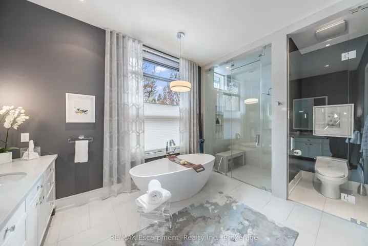 +"PublicRemarks": "An exceptional custom-built luxury residence in Burlington's most coveted neighbourhood - Roseland. Refined craftsmanship, thoughtful architecture, and elevated finishes come together to create a home that is both striking and deeply livable. Premium walnut flooring, soaring ceilings with exposed steel beams, and extensive custom millwork establish a sophisticated tone throughout. Oversized Pella windows, paired with custom drapery and blinds, flood the home with natural light while creating a seamless connection between indoor and outdoor living. At the heart of the home, the chef's kitchen is designed to impress. The dramatic island anchors the space, complemented by a Wolf gas range, Sub-Zero refrigerator and beverage fridge, quartz countertops, and a spacious walk-in pantry with custom organizers, perfectly suited for both everyday living and effortless entertaining. The main level is complete with a private primary sanctuary offering a peaceful retreat, with a spa-inspired ensuite and steam shower, and custom dressing room. A dedicated office with built-in shelving, a well-appointed laundry room, and a thoughtfully designed mudroom with custom storage complete the level with both elegance and practicality. Upstairs, two generously sized bedrooms each feature walk-in closets and private ensuites, along with rough-in for future secondary laundry. The fully finished lower level expands the home's living space with in-floor heating, a wet bar, projector TV area, wine cellar with potential for temperature control, an additional bedroom with ensuite, and flexible space ideal for a home gym, studio, or additional storage. A rare opportunity to own a meticulously crafted custom home where design, comfort, and luxury living are perfectly balanced."