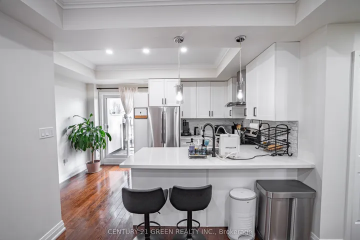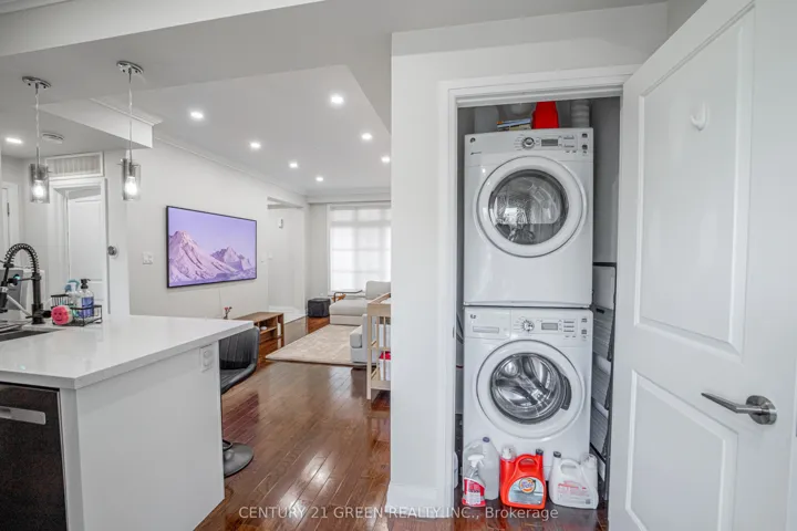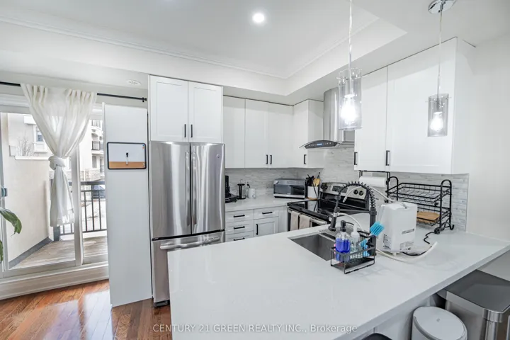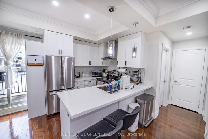 +"PublicRemarks": "Executive living at its finest. Beautiful and functional 1-storey townhouse offering a spacious open concept layout with high ceilings and plenty of natural light. The main living area flows seamlessly into the kitchen featuring a breakfast bar, perfect for entertaining or everyday living. This luxury 1 bedroom, 1 bathroom home features a stunning marble bathroom and high end finishes throughout. Enjoy approximately 800 sq ft of combined indoor and outdoor living space in a well maintained unit designed for comfort and convenience. Includes ensuite washer and dryer plus rare 2 car parking with one driveway space and one built-in garage. Excellent location with easy access to Hwy 403, 401, 410 and the QEW, Convenient public transit with one bus to the subway. Status certificate available. Perfect for first time buyers, professionals or investors looking for a stylish and low maintenance home in a great location."