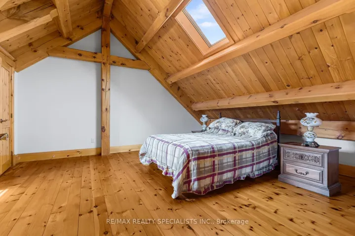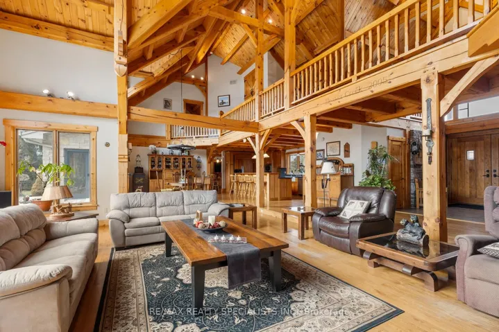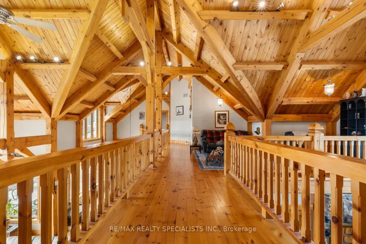 +"PublicRemarks": "Set on a scenic 3.2-acre lot in Milton, this custom-built Canadian post and beam home offersthe perfect blend of luxury and natural beauty. Located on Trafalgar Road, just across from Piper's Heath Golf Club, the property backs onto a peaceful river and features a secondlower patio right at the shoreline.With approximately 5,900 sq ft of living space, the home showcases soaring 26-foot ceilingsin the main living and dining area, custom hardwood floors throughout, and expansivewindows overlooking the backyard. A striking stone fireplace anchors the living room andextends into the basement, adding warmth and character across both levels.The kitchen is designed for both function and entertaining, featuring a gas cooktop, largeisland, and pantry. Just off the kitchen, a separate entertainment room filled with skylightsand natural light provides the perfect space to host, with access to a covered backyard patiocomplete with a sink for outdoor cooking or gardening.The main floor primary suite includes two closets, a 5-piece ensuite, and direct backyardaccess. Upstairs, you'll find three spacious bedrooms, each complete with its own privateensuite-ideal for family living or accommodating guests in comfort and privacy.The basement offers a spacious recreation area and additional bedroom potential, ready tobe customized to your needs. A 6-car garage with a large loft, parking for 11 vehicles, and abuilt-in security system complete this exceptional custom family home."
