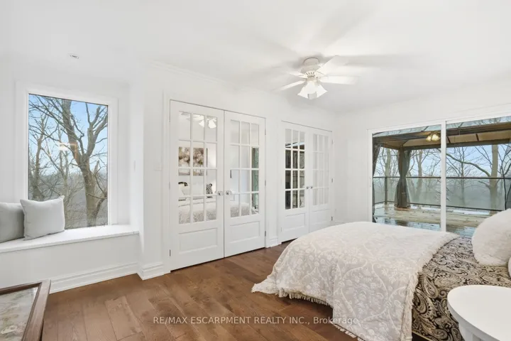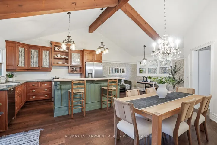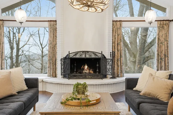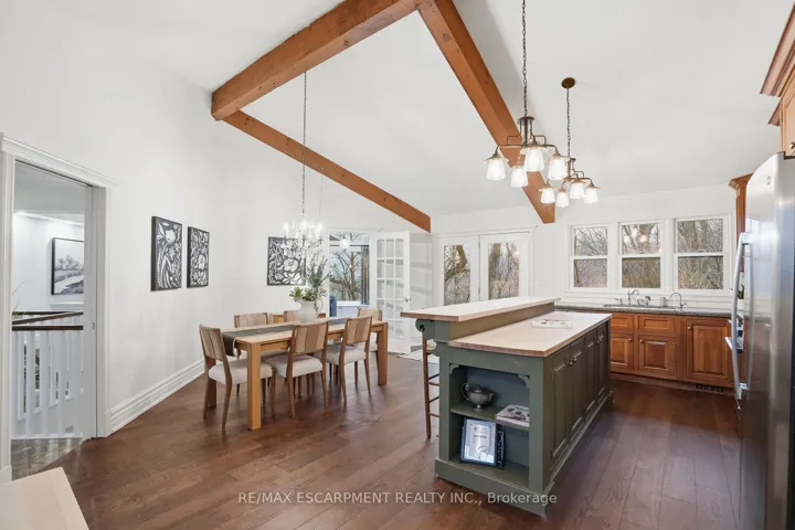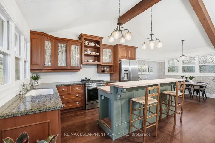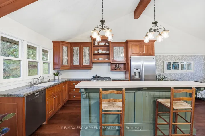 +"PublicRemarks": "Tucked away on a picturesque 1-acre lot backing onto Grindstone Creek, this beautifully renovated raised bungalow offers the ultimate in privacy, tranquility, and multi-generational living. Surrounded by mature trees and natural beauty, this truly one of a kind offering delivers peaceful, country-style living just minutes from city amenities. The main level features three spacious bedrooms, including a serene primary retreat with a private ensuite and walk-out to the primary level deck. Set high in the Carolinian tree canopy, this large outdoor space is perfect for morning coffee, entertaining, or unwinding at sunset. The bright, airy living room is highlighted by vaulted ceilings, expansive windows that flood the space with natural light, and a cozy, raised hearth fireplace as its focal point. The custom made, cherry wood eat-in kitchen blends function and style, showcasing stainless steel appliances, granite countertops, and ample cabinetry-ideal for both everyday living and entertaining. The fully finished walkout basement offers excellent versatility with a self-contained in-law suite featuring a separate entrance, one bedroom, a full bathroom, dedicated laundry, a large great room with gas woodstove, and a bonus three season sunroom leading to a private outdoor deck-perfect for extended family, guests, or potential rental income. This exceptional property offers a unique lifestyle opportunity in one of Burlington's most desirable and undiscovered settings. RSA."