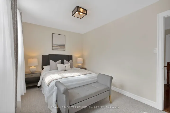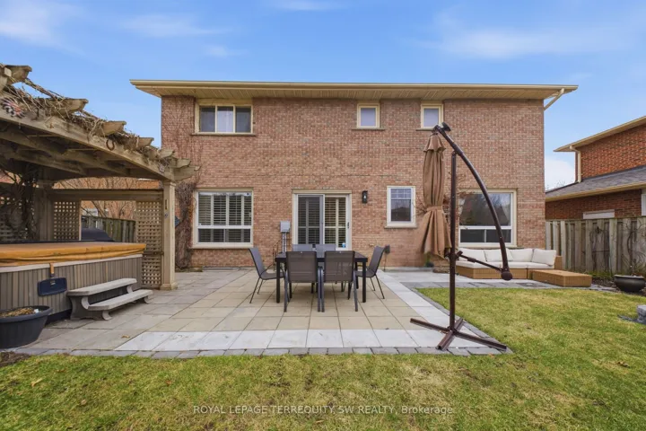 +"PublicRemarks": "Luxury meets tranquility in this sought after Rathwood community located on a quiet Cul-De-Sac on a large lot with an extra long double wide driveway and double car garage allowing seven total parking spaces . Upon arrival you will be greeted with a beautifully landscaped exterior with an all brick two storey home. Stepping in through the brand new doors you will be immediately notice that it is newly painted (2023) with many large newly installed windows throughout, exuding natural sunlight in every room. The spacious dining room is combined with the living room with a new custom fireplace with pot-lights, crown moulding (2022) and hardwood, perfect for entertaining and large gatherings. The modern Victorian style kitchen with stone countertop and high-end stainless steel kitchen appliances is combined with the family room and has luxurious travertine natural limestone floor tiles expanding into the laundry room where you have a new washer and dryer with separate entrance and built-in cabinets. On the second floor you have newly installed carpets throughout (2022) with two renovated bathrooms (ensuite 2023) and 4 generously sized bedrooms, perfect for large families. The primary bedroom has a large walk in closet with a 3-piece tiled bathroom with glass walk in shower. The spacious main 4-piece bath has light colour tiles with tiled shower walls. The spacious basement is currently set up as two bedrooms with an office between them, a large living room with exercise room and brand new renovated top to bottom tiled bathroom, perfect for guests and families staying overnight. The basement layout can easily be converted into three bedrooms if more sleeping space is required. Stepping into the backyard oasis you have a brand new stone patio with a hot tub (as is) under a pergola, large shed and a fire pit, a great way to spend your evenings under the stars or hosting parties. Conveniently located near parks, highways, shops, restaurants, schools and public transit."