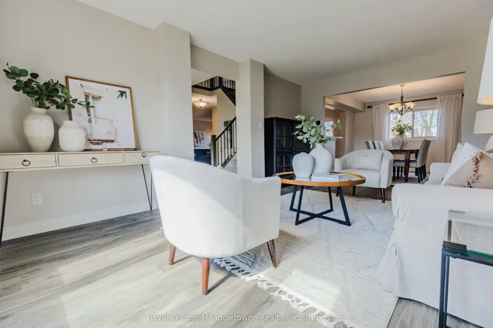 +"PublicRemarks": "Beautifully maintained Hutton model offering approximately 2400 sq ft of living space, ideally located on a highly sought-after street and backing onto greenspace, a walking trail, and a school. This inviting home welcomes you with a spacious and impressive front foyer, a combined living and dining area, and a newly updated staircase. The main floor also features a cozy family room with walkout access, a 2 pc powder room, a potential main-floor laundry room, and a convenient mudroom off the double car garage. The bright, spacious kitchen is perfect for entertaining, complete with a separate cooking area and a walkout to a private landscaped backyard with an irrigation system. All four bedrooms are generously sized, including a primary suite with a 4-piece ensuite. A practical laundry chute runs from the second floor main bathroom directly to the basement laundry/craft room. The finished basement is designed for entertaining, featuring a large recreation room, fireplace, we bar, and versatile spaces including a dance or yoga area or workshop. Additional highlights include a high-efficiency heat pump system(2023),central air conditioning, upgraded windows and plenty of parking. Located in a welcoming community close to schools, parks, trails, shopping, hospital, sports facilities, arts centre, GO transit, and major highway- this exceptional home is a must-see!"