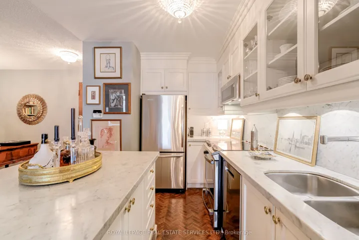 +"PublicRemarks": "Luxury Living Beyond the Box in the Sky! Stop settling for cookie-cutter units and step into a residence that truly feels like home. This boutique-style condo has been meticulously renovated with designer finishes and an open-concept flow. The heart of the home is a chef-inspired kitchen featuring Carrera marble countertops and backsplash, a generous island with seating, and premium newer appliances. Every detail of this home has been elevated: from the warmth of herringbone wood floors throughout to custom-built library shelving in the den and custom closet doors. Retreat to a spa-like bathroom featuring tumbled marble flooring and a stylish floating vanity. Enjoy sunset cocktails or morning cappuccinos on your large private balcony with unobstructed west views over the park and neighbourhood. This wonderful condo is located in an elegant and secure building with a 24-hour security gatehouse, fully equipped modern fitness room with premium commercial cardio and strength training equipment, renovated party room, library and new secure courier/package lockers. Condo includes newly installed fan coil unit with warranty. Located just minutes to Islington subway station, lots of restaurants, shops, schools and a quick drive to HWY 427 or the Gardiner expressway. This is a rare opportunity for the discerning buyer. A true must-see. Welcome Home!"