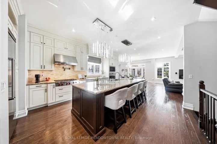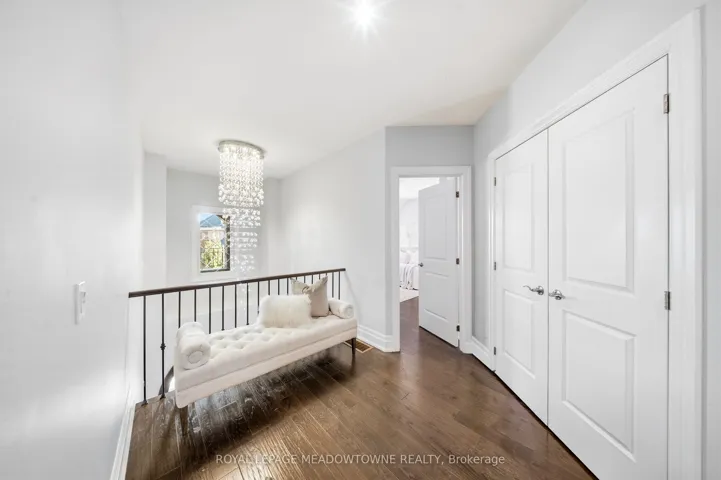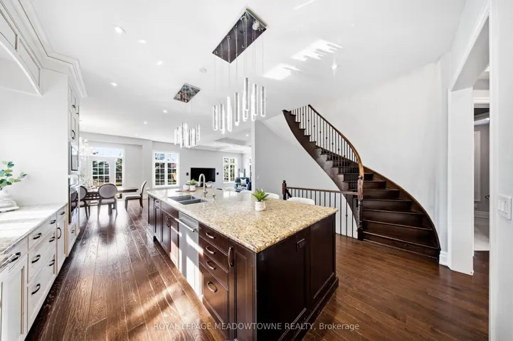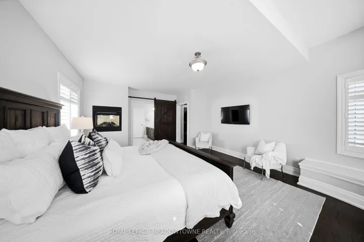 +"PublicRemarks": "Stunning executive home set on 0.42 acres in a private cul-de-sac within the prestigious Meadows in the Glen community. An interlock driveway leads to a charming courtyard entry and triple car garage, offering exceptional curb appeal. Step into the grand foyer with soaring ceilings, opening to a private main floor office and an elegant separate living room with coffered ceiling overlooking the beautifully landscaped front yard. The open-concept main living space showcases luxurious finishes throughout, including gleaming hardwood floors, pot lights, and expansive sun-filled windows. The chef's kitchen features high-end built-in stainless steel appliances, a large centre island, custom backsplash, and flows seamlessly into the dining area with walkout to the backyard patio and a warm, inviting family room with fireplace. The spacious primary suite offers a large walk-in closet, charming circular window seat, 2-sided fireplace shared with the spa-like ensuite complete with double sinks, separate water closet, and glass-enclosed shower. Three additional bedrooms, each with ensuite access, complete the upper level. The finished basement extends the living space with a generous recreation room featuring a built-in bar and fireplace, two additional bedrooms, a home gym, and a 3-piece bathroom. Enjoy a private backyard oasis surrounded by mature trees, complete with a gazebo, firepit, and playset-perfect for family living and entertaining. Ideally located with a walking trail at the end of the cul-de-sac connecting directly to the Bruce Trail, leading into the charming village of Glen Williams and along the Credit River."