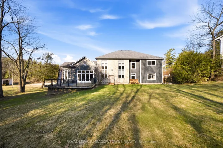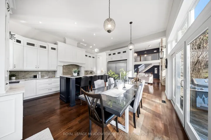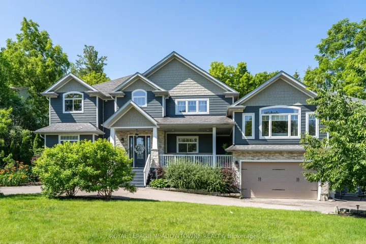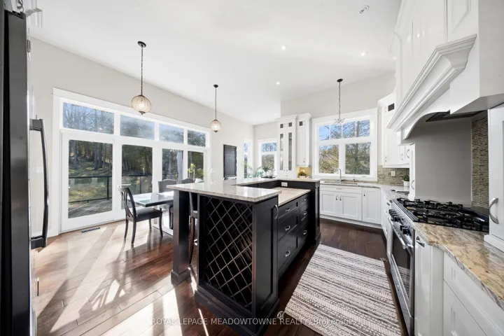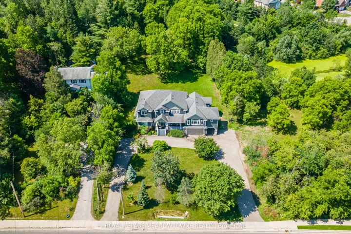 +"PublicRemarks": "Custom-built detached home set on a picturesque 1-acre lot backing onto conservation, offering exceptional privacy and natural views. A circular driveway provides ample parking and leads to a built-in two-car garage plus covered parking area. Welcoming covered front porch opens to a sunken foyer.The open-concept great room impresses with soaring 17-ft ceilings, a striking stone fireplace, and expansive windows that flood the space with natural light. The gourmet kitchen features high-end stainless steel appliances, a centre island with built-in wine rack and breakfast bar, and is combined with the dining area with walkout to a large raised deck-ideal for entertaining.Main floor highlights include a private office, perfect for working from home, and a spacious primary retreat with his and hers closets, a 5-piece ensuite, and serene ravine views. Above the garage, a separate living space offers a family room with cathedral ceiling, bedroom, and ensuite-perfect for guests or extended family.The second level is accessed by an open staircase overlooking the great room and features three additional bedrooms, all with ensuite access. A fully finished walk-out lower level includes an in-law suite with its own bedroom, kitchen, and bathroom, providing excellent multi-generational living potential.Ideally located in the heart of Georgetown, close to the hospital, fairgrounds, The Club at North Halton, and an abundance of scenic paths and trails."
