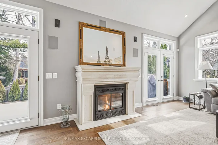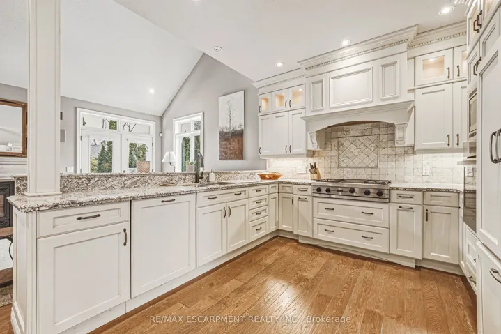 +"PublicRemarks": "This STUNNING renovated, detached BUNGALOFT sits in a quiet enclave in Aldershot. Featuring 3+2 bedrooms, 3.5 bathrooms, over 2400 square feet PLUS a fully finished lower level and a DOUBLE car garage! The home features quality designer finishes and fixtures throughout. The open concept floor plan boasts vaulted ceilings, hardwood flooring and plenty of natural light. The large foyer opens to the dramatic, oversized dining room with 14' ceilings. The incredible kitchen features custom cabinetry, a large accent island, granite counters and top-quality appliances. The kitchen flows directly to the large 2-storey family room which includes custom built-ins, a gas fireplace, in-wall speakers and two sets of french doors leading to the private backyard. The large primary bedroom has a walk-in closet and a spa-like 4-piece ensuite with heated flooring. The main level also includes a separate powder room and garage access! The 2nd level includes 2 spacious bedrooms, a beautiful 4-piece bathroom and laundry room. The professionally finished lower level features 9 ft ceilings, radiant in-floor heat flooring throughout, 2 bedrooms AND a den, a 3-piece bathroom, large rec room / media room and plenty of storage space! The exterior of the home has been extensively landscaped and features a private low maintenance backyard with a large deck and turf! Amazing location- close to all amenities and transportation!"