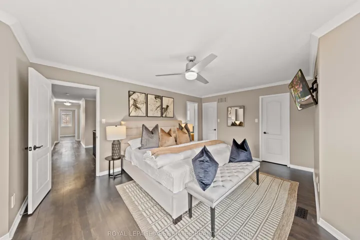 +"PublicRemarks": "Welcome to 33 Hutton Cres, an elegantly renovated 5-bedroom residence offering 2,870 sqft of sophisticated above-grade living space in the heart of the highly sought-after Valleywood community. Situated on a premium pie-shaped lot, this move-in-ready home features 7mm engineered hardwood flooring and elegant pot lights throughout the main level, providing a seamless flow into the spacious family room and the stunning living area, anchored by a custom stone feature wall and a sleek gas fireplace. The gourmet kitchen is a chef's dream, equipped with modern black stainless steel appliances, a comfortable breakfast table area, and a convenient walk-out to a beautifully landscaped backyard retreat complete with a private gazebo. The upper level is exceptionally rare, boasting a spacious primary retreat with two reach-in closets and a decadent 5-piece luxury ensuite, alongside a secondary master bedroom that also features a semi ensuite bathroom. With three additional spacious bedrooms upstairs, all with custom closets, this home provides ample space for large families. The home is fully landscaped in the front and back, complemented with exterior pot lights that illuminate the home at night."