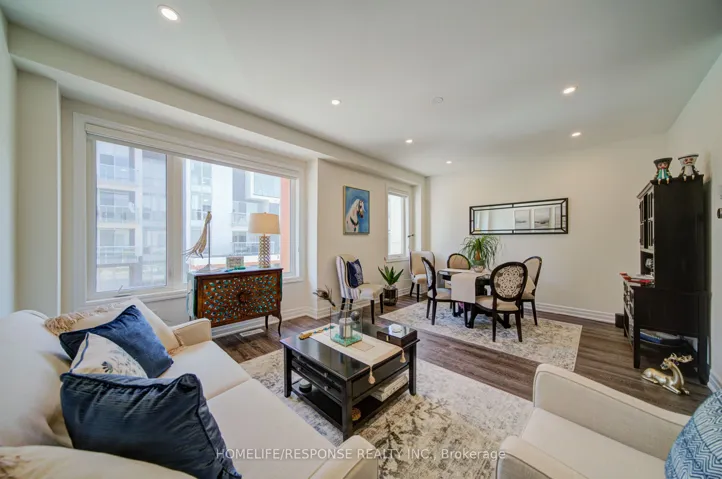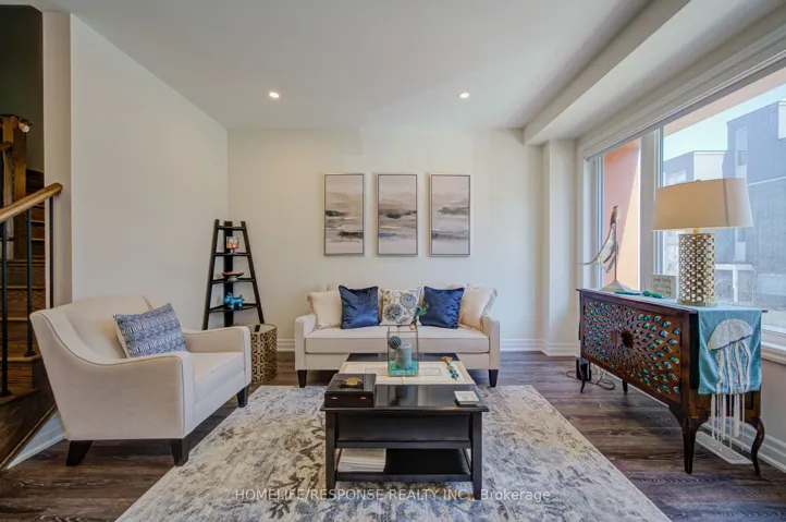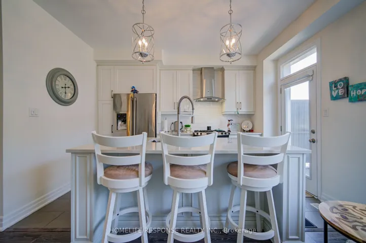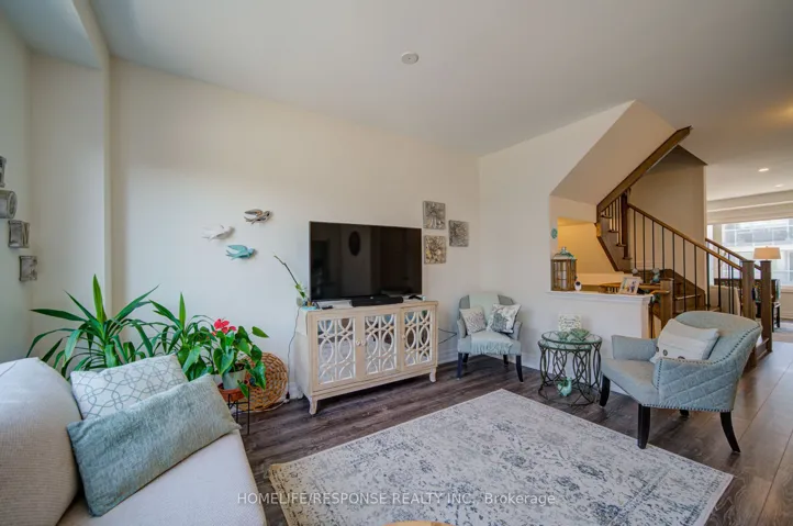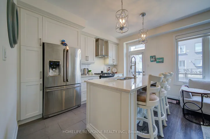 +"PublicRemarks": "Highly upgraded executive townhouse in the prestigious Preserve community, featuring 3 bedrooms, 3 bathrooms, and a 2-car garage. Beautifully maintained and move-in ready with designer neutral décor throughout. Spacious main living area on the first floor filled with natural light, complete with stylish zebra blinds for adjustable brightness and privacy. Elegant family room with open-concept layout, large windows, tray ceiling, pot lights, and a sleek built-in fireplace with wall-mounted TV. Modern kitchen with island and breakfast bar, quartz countertops, upgraded stainless steel appliances, professional hood fan, and a stunning backsplash. Dining area with walk-out to a private balcony, perfect for entertaining. Featuring smooth 9-ft ceilings throughout all levels, a beautiful oak staircase, and premium finishes throughout. The primary bedroom offers a walk-in closet and a 4-piece ensuite. Ideally located close to top-rated schools, a new hospital, great shopping, and scenic trails"