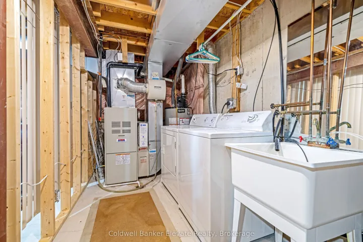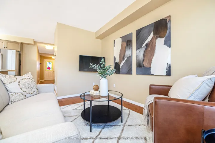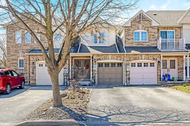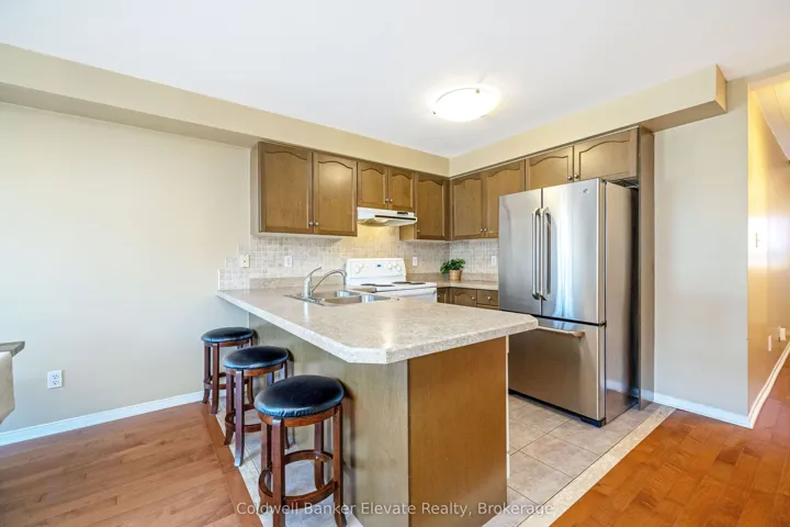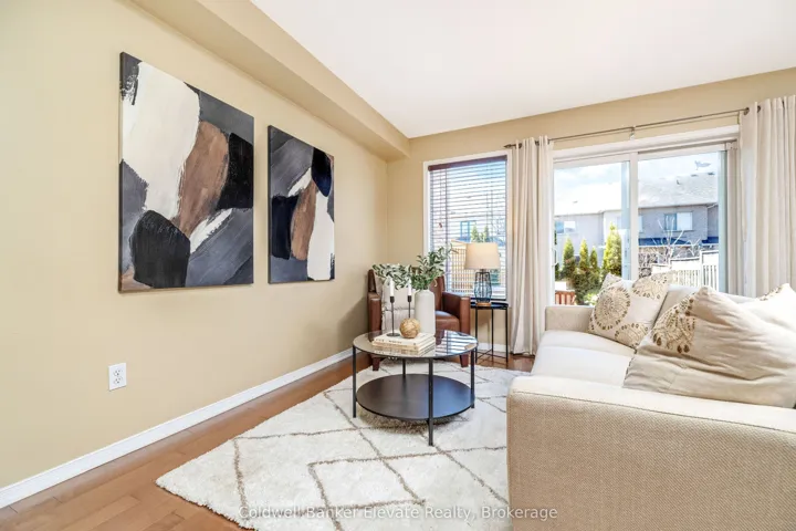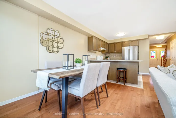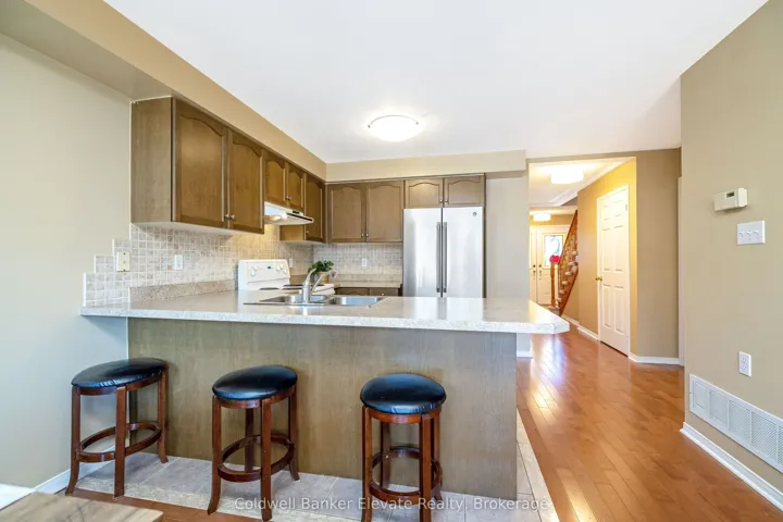 +"PublicRemarks": "Welcome to this beautifully maintained freehold townhouse offering comfort, functionality, and thoughtful updates throughout. The landscaped front yard, stone walkway, and covered front porch create a warm and inviting first impression, complete with a private driveway with parking for two and an attached garage with overhead and hanging storage. Step inside to a bright and welcoming main level featuring solid 3/4 inch hardwood flooring through the hallway, living room, and breakfast area. The open concept layout is ideal for both everyday living and entertaining, with large windows and a double sliding glass door walkout that fills the space with natural light and provides seamless access to the backyard. The kitchen is both functional and inviting, offering warm brown cabinetry with curved panel detailing, a tile backsplash with multiple outlets, stainless steel appliances, and a breakfast bar with comfortable seating. Upstairs, the spacious primary bedroom offers a peaceful retreat with two windows overlooking the backyard, a chandelier, and two double closets for ample storage. The semi-ensuite 3 piece bathroom features a tub and shower combination, built-in vanity, and convenient access from both the bedroom and hallway. A second bedroom with front yard views, broadloom flooring, and a double closet completes this level. The unfinished basement presents excellent potential, with framing and electrical already completed, offering a great opportunity to create additional living space, a recreation area, or a home office. The private backyard is a true highlight, featuring a brand new spruce deck (2025), new fencing (2025), and beautifully landscaped gardens filled with mature perennials including hydrangeas, lilies, and magnolias, creating a peaceful outdoor setting to enjoy. A wonderful opportunity to own a move-in ready home in a family friendly neighbourhood with space to grow and make it your own."