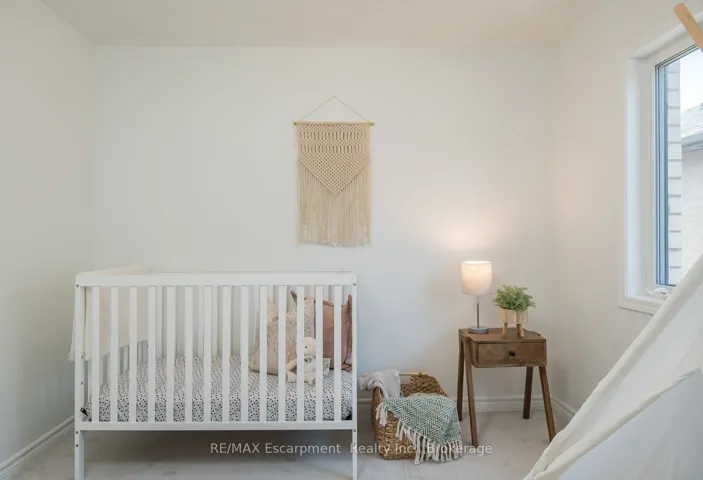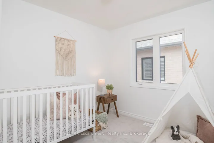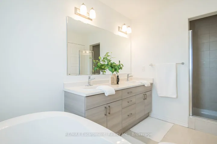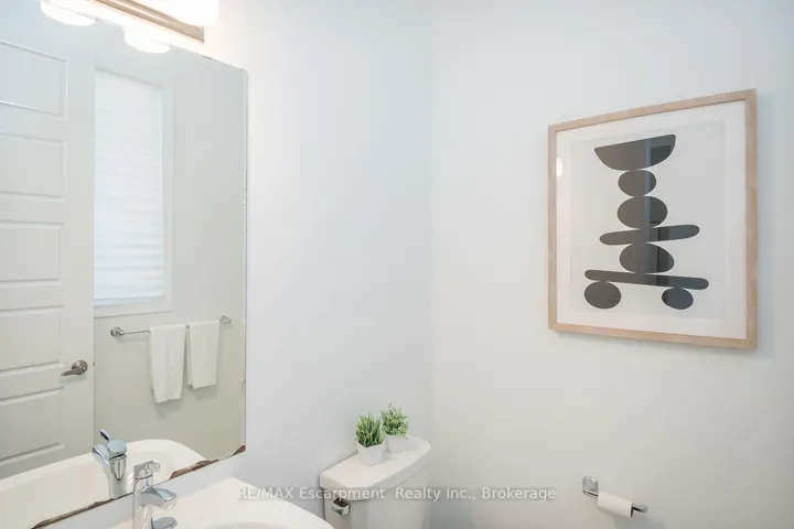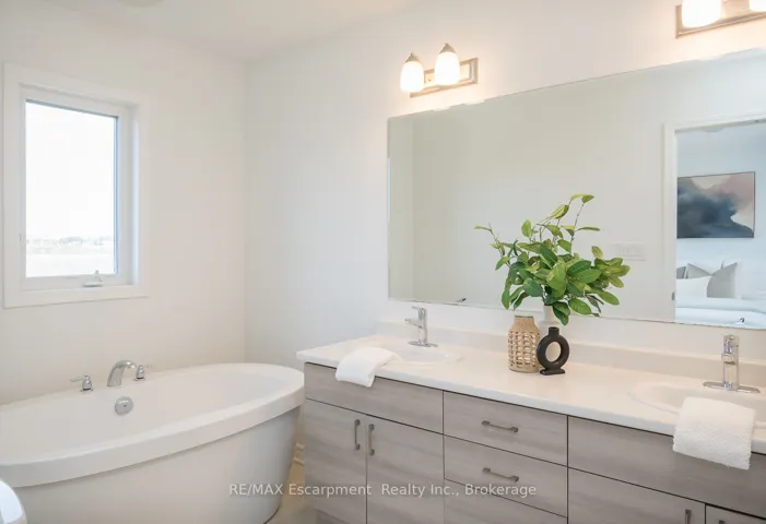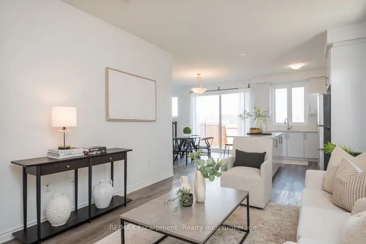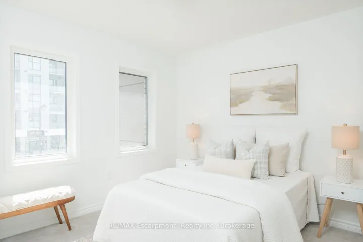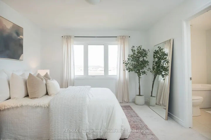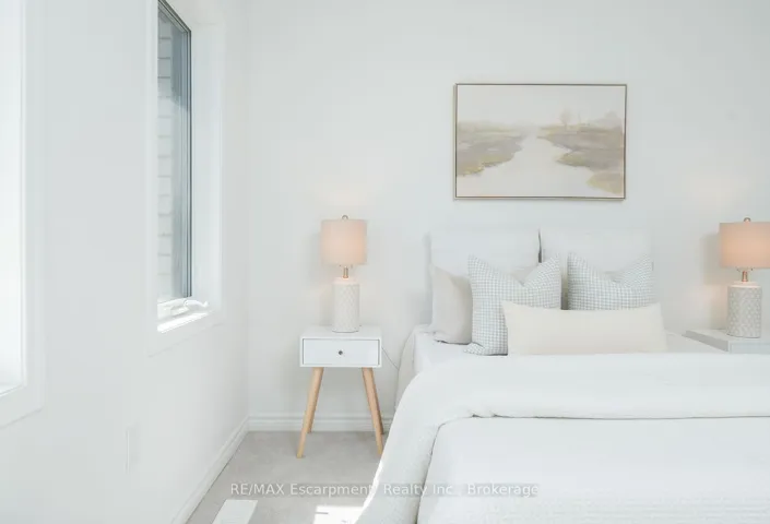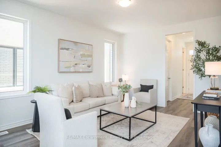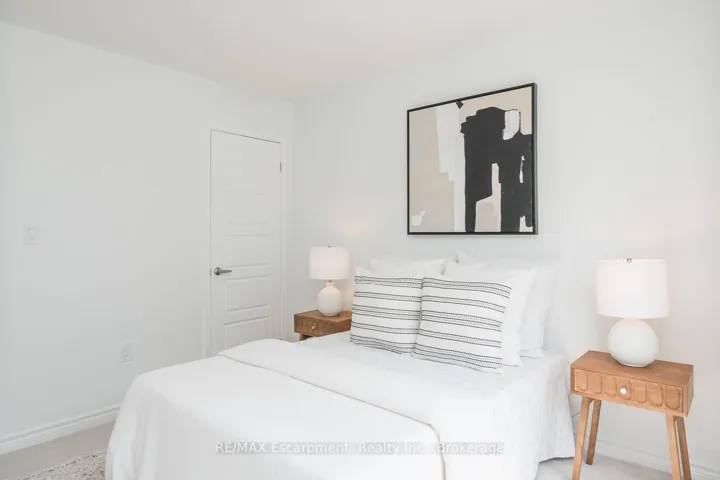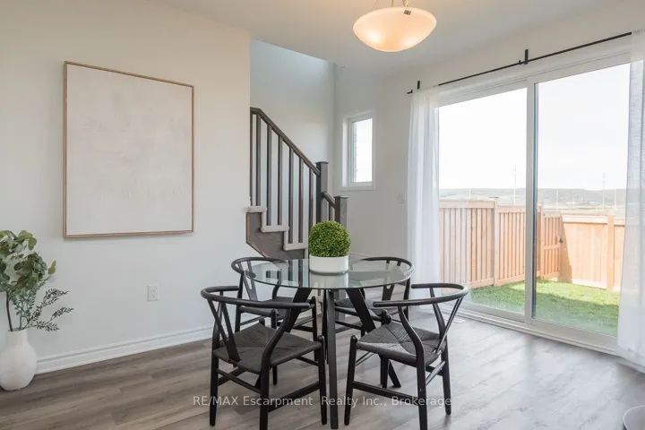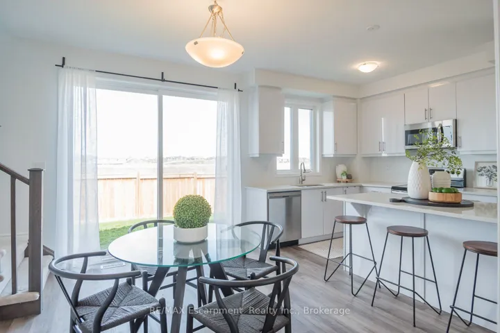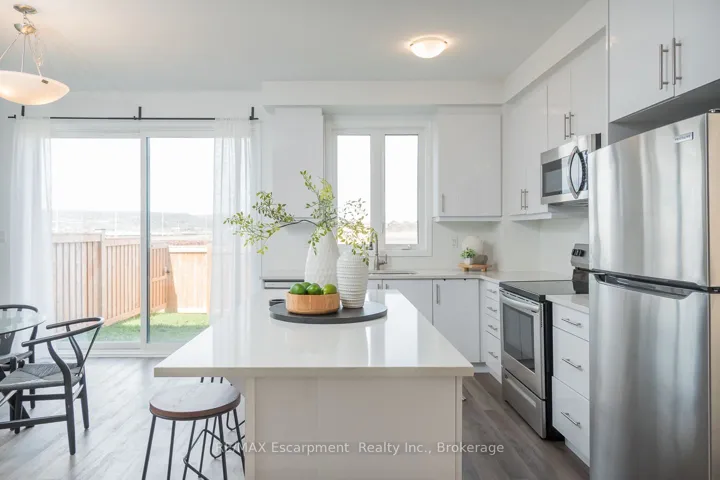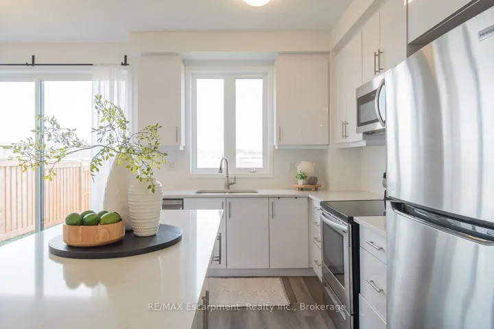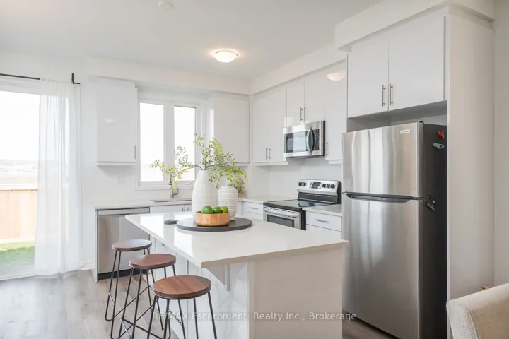 +"PublicRemarks": "Spacious 4 bedroom end-unit townhome with a thoughtful layout, 9 ft ceilings, and escarpment views. The main floor features a bright kitchen with white cabinetry, quartz countertops, stainless steel appliances, and a centre island with breakfast bar seating. Double sliding doors lead to a fully fenced backyard, making indoor-outdoor living easy, while main floor laundry and interior garage access add convenience. Upstairs, the two-storey staircase with wood spindles opens to four bedrooms and a 4-piece main bathroom. The primary suite offers a walk-in closet, double sink vanity, enclosed shower, and freestanding soaker tub. Three additional bedrooms and a large linen closet complete the level. The all-brick exterior and black-framed windows provide strong curb appeal in Milton's sought-after Walker neighbourhood. All major mechanicals are under five years old making this a move-in ready home!"