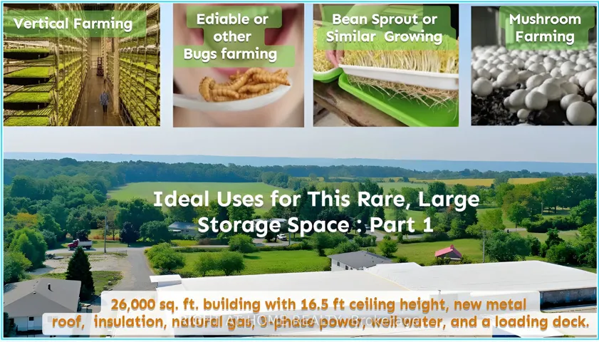 +"PublicRemarks": "Located in the highly sought-after Flamborough area, this property provides convenient access to Highway 5, Highway 6, the 403, the City of Hamilton, and the Greater Toronto Area, making it an ideal location for a variety of business operations. The barn boasts 16,000 square feet of space with a generous 16.5-foot ceiling height. It features a brand-new metal roof, full insulation, and is equipped with 3-phase power, natural gas, well water, and a durable concrete floor. Additionally, it includes a loading dock for easy access and logistics. The interior of the barn is designed with removable walls, offering flexibility to adapt the space for a range of purposes, including storage, vertical farming, mushroom cultivation, bean sprout production, edible insect farming etc. Additional Details: 1. The barns existing structure allows tenants to modify or customize the interior based on their specific needs, at their own expense. 2. The lease is priced at $5.50 per square foot, per year. Tenants will be responsible for all utility costs. 3. Approximately 6-7 acres of workable land are available for lease at the rear of the barn. If desired, the land can be rented at a negotiable rate."