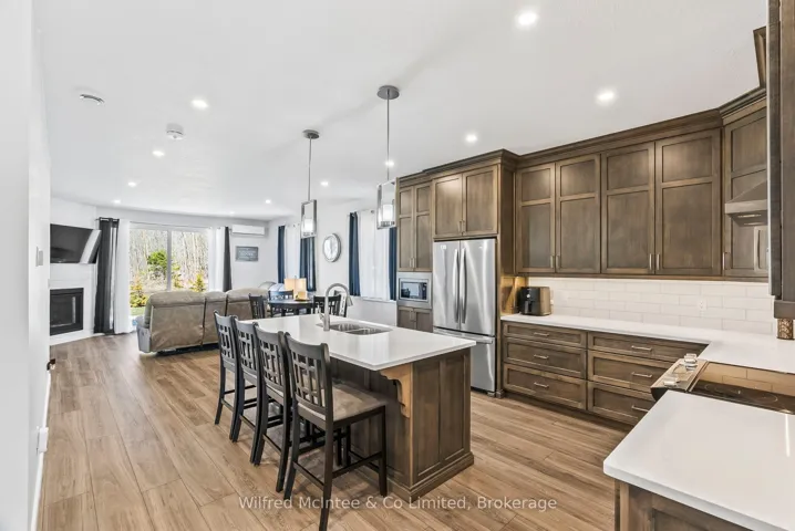 +"PublicRemarks": "Welcome to carefree living in this impressive life lease end unit, located in a quiet and friendly adult community in the charming town of Chesley. Built in 2022, this home showcases exceptional workmanship and high-end finishes throughout. Step inside and experience the warmth of VP flooring with in-floor heating, complemented by ductless air conditioning for year-round comfort. The open-concept living space features a kitchen with custom maple cabinetry, quartz countertops, and a large island with breakfast bar perfect for entertaining along with dining area and living room with gas fireplace. The spacious primary bedroom includes a walk-in closet and a luxurious ensuite bathroom. A convenient 4 pc. bathroom/laundry combo and a second bedroom offer flexibility for guests or hobbies. Enjoy the ease of an attached garage lined with Trusscore, and say goodbye to outdoor chores as all exterior maintenance, snow removal, and lawn care are taken care of. Monthly fee (2024) $371.70. This is more than a home it's a lifestyle. Don't miss your chance to join this welcoming community in a beautiful, modern setting."
