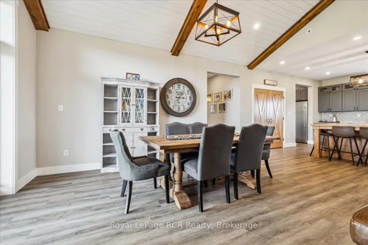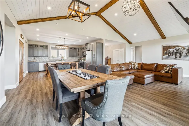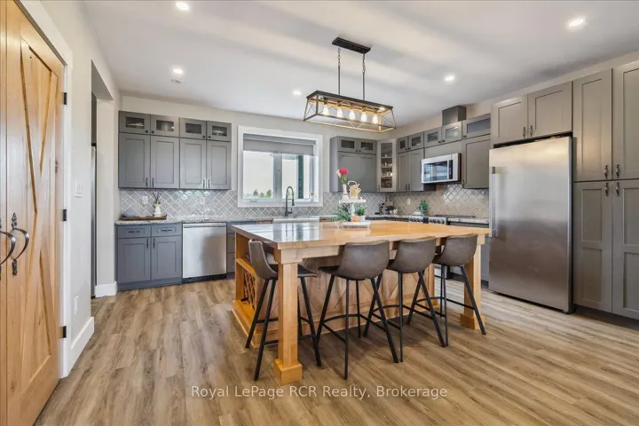 +"PublicRemarks": "Welcome to a home that has it all, style, space, and seriously great vibes! This custom stone beauty offers 5 bedrooms, 4 bathrooms, and sits on just over 2 acres, giving you the perfect mix of peaceful country living and convenience, only 10 minutes to Owen Sound. Designed with flexibility in mind, it's ideal for a growing family or anyone looking for a multigenerational living setup. The in-law suite is a standout feature, completely separate and located above the triple car garage. It includes 2 bedrooms, a 3-piece bathroom, a full kitchen, and a bright living room with a walkout to a private balcony. Whether it's for parents, adult kids, or guests, this space offers both comfort and independence under one roof. The triple car garage is a dream on its own, with a drive-thru 4th door and heated floors. And speaking of heat, you'll enjoy in-floor heating and luxury vinyl flooring throughout the entire home, perfect for cozy, low-maintenance living. The main living area is open-concept and made for connection, with the kitchen, dining, and great room flowing seamlessly together. Vaulted ceilings with wood beams add charm to the great room and dining area, anchored by a floor-to-ceiling stone fireplace. The kitchen is both stylish and functional, featuring a large all-wood island, stunning live-edge quartz countertops paired with custom cabinetry, stainless steel appliances, and a spacious walk-in pantry. The primary suite is your personal retreat, complete with a spa-like 5-piece ensuite featuring a soaker tub and a generous walk-in closet. The additional bedrooms are bright, comfortable, and offer plenty of space for family, guests, or a home office, each finished with the same beautiful attention to detail and quality found throughout the home. If you're looking for space to grow, room to breathe, and a home that fits your lifestyle, this is the one!"