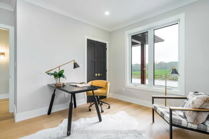 +"PublicRemarks": "Experience the charm of a unique floor plan that makes this golf course bungalow both welcoming and exceptional. With over 2,200 square feet of thoughtfully designed living space, the home feels even more expansive thanks to its spacious front entrance and breathtaking great room. A stunning 14-foot-high stone feature wall anchors the open-concept living area, complemented by an elegant linear fireplace that adds warmth and drama. Many of the design details have been carefully curated by an interior designer to create a warm, earthy palette, featuring two-tone kitchen cabinetry, white oak flooring, and Benjamin Moore paint throughout. Stylish, modern lighting selections further elevate the home's custom aesthetic. The great room opens to a covered backyard retreat -- an ideal space to relax and take in the tranquil views of the manicured greens and mature trees of the Meaford Golf Course. Solid wood, three-panel interior doors -- extra tall and painted black -- are paired with upgraded gold-tone hardware, adding a refined touch throughout. The generous primary bedroom offers sliding door access to the backyard and golf course views. Two additional bedrooms -- both bright and spacious -- share a sleek four-piece bathroom. One of these rooms is perfectly suited for use as a home office or cozy den. All bathrooms feature high-end, contemporary finishes. Skylights in the kitchen bring in additional natural light, while pot lights throughout ensure a bright and welcoming atmosphere. A custom mudroom off the garage offers practical, organized storage. The exterior showcases a striking blend of wood and cultured stone, with a stamped concrete driveway leading to modern windowed garage doors. Comfort is top of mind with hydronic in-floor heating in both the garage and lower level."