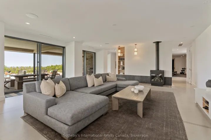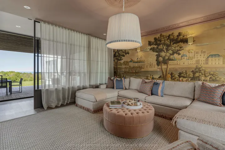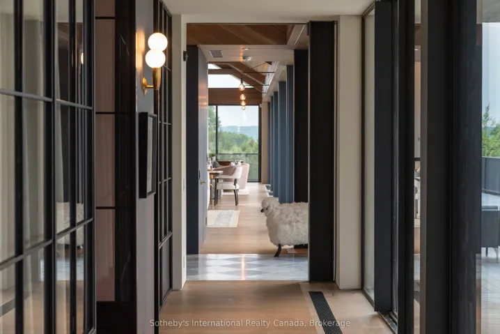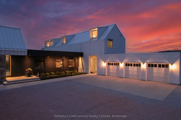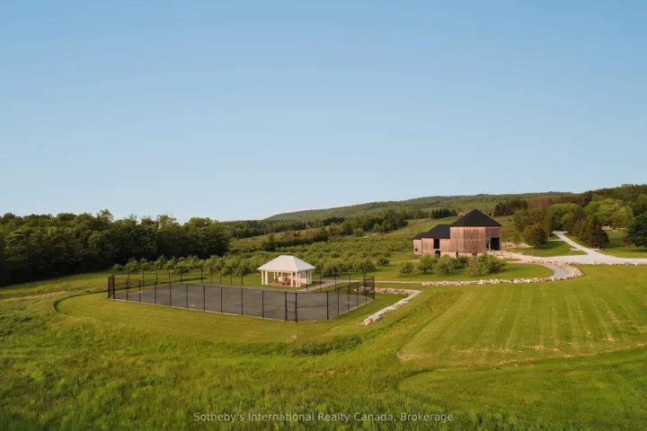 +"PublicRemarks": "Never has there been an offering like this in Blue Mountains. Welcome to Georgian Valley Farm, where world-class design meets the untouched beauty of nature and stunning sunsets. Set on 37 spectacular acres, this one-of-a-kind estate is anchored by an extraordinary 11,000 sq ft custom residence - a design landmark by Post Architecture Inc. and crafted by renowned builder David Eaton, Baylyn Construction. This property is the definition of luxury recreational living, w/saltwater pool, Har Tru clay tennis court, orchard, pond, a Hartley Botanic Greenhouse - 'Grand Manor' imported from the UK and an incredible restored barn, ready for entertaining. Perched high on 7th Line, the home presents commanding, panoramic views of the Niagara Escarpment and Georgian Bay from nearly every room. Scandinavian-inspired minimalism blends with refined country elegance, w/ Moncer European oak floors, soaring wood-clad ceilings, and a wall of floor to ceiling windows by Atek that frame the landscape. Chef's kitchen features a 12-ft marble island, appliances by Miele, Sub-Zero, and Lacanche, custom Barlow millwork, exquisite stonework and a full butler's pantry. The dining room for 14 includes a concealed Barlow bar and a striking 2-way woodburning STUV fireplace shared with the living room. Thoughtful details abound throughout w/ designer lighting, imported tiles and hand-painted De Gournay wallpaper in the adult lounge, library, and powder room. A main floor primary sits behind double Egyptian doors and features a gas fireplace, luxurious ensuite, WIC, and sitting area. 4 upper bedrooms, all uniquely designed, feature gorgeous curated ensuites with extensive tile/marble finishes, custom millwork and WIC. The lower level offers a golf simulator, gym, sauna, rec room, refreshment area, 200+ bottle Rosehill Wine Cellar, and w/o to the covered terrace and pool. The exceptional outdoor living offers a 2,520 sq ft deck, with a full Crown Verity kitchen, dining & lounge areas, and a hot tub."