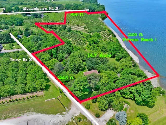 +"PublicRemarks": "Possibly the most desirable Lake Ontario waterfront property from the GTA to the Niagara Region! This secluded 14.59-acre paradise is perfect for investors or those seeking a private lakefront retreat. Located on two quiet, scenic dead-end lakefront roads, the property offers over 200 ft of frontage on both Mountainview Rd and Thirty Rd N. Just minutes to the QEW, nearby towns, the future GO Station for high-speed rail connecting the GTA and Niagara Falls and approximately 3050 minutes to Hamilton, the GTA, Niagara Falls, and the U.S. border. Surrounded by rapidly growing developments along the QEW, the lands value is expected to increase significantly in the coming years. A private winding driveway leads to a well-built custom 2-storey villa (1989, original owner), set among mature pines and hardwoods. The home features 2,922 sq ft above grade plus a 1,393 sq ft walk-out lower-level in-law suite with lake views. A rustic boardwalk leads to your own untouched 1,100+ ft beach. Inside, you'll find spacious principal rooms with hardwood flooring, solid oak cabinetry, trim, and staircase. The upper level includes 4 bedrooms ,primary with 5-pc ensuite, and a guest suite with a 3-pc ensuite. Additional features: Two 6,000-gallon cisterns Inspected septic system 200-amp service Quality windows, brick exterior Roof (2020), Furnace (2021), A/C (2019), Central vac. Bonus: Vendor indicates a potential severance of a 1.5-acre homesite from an unopened road allowance , with approx. 13 acres remaining for a second residence. Most of the land is planted with fruit trees, maintained by a neighboring farmer. No reported income (likely HST exempt). Vendor Take Back mortgage (VTB) available. Endless possibilities: Ideal for a luxury estate, B&B, wedding venue, winery with lakefront dining, or seniors retreat, Lakeside Greenhouse and Recreation Complex . Quiet, scenic, and truly one of a kind. A rare opportunity must be seen!"